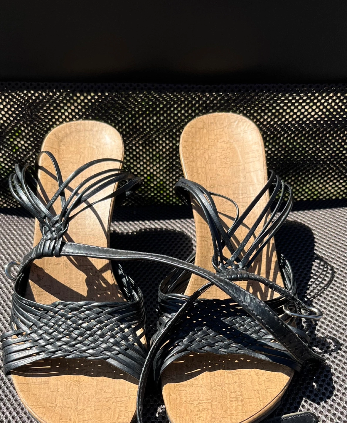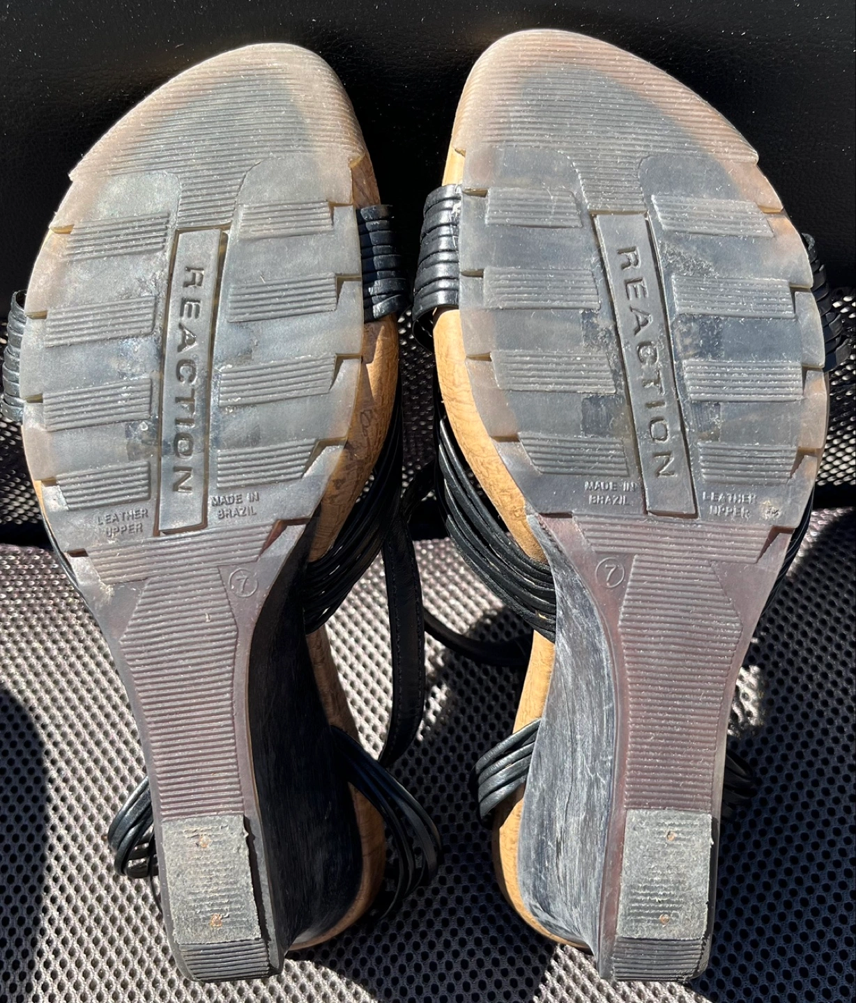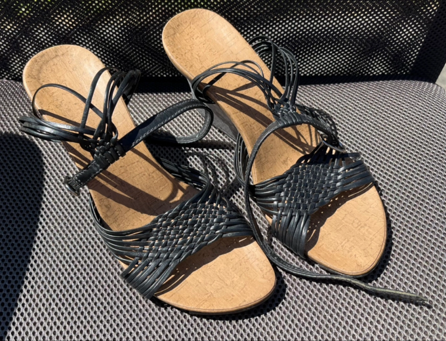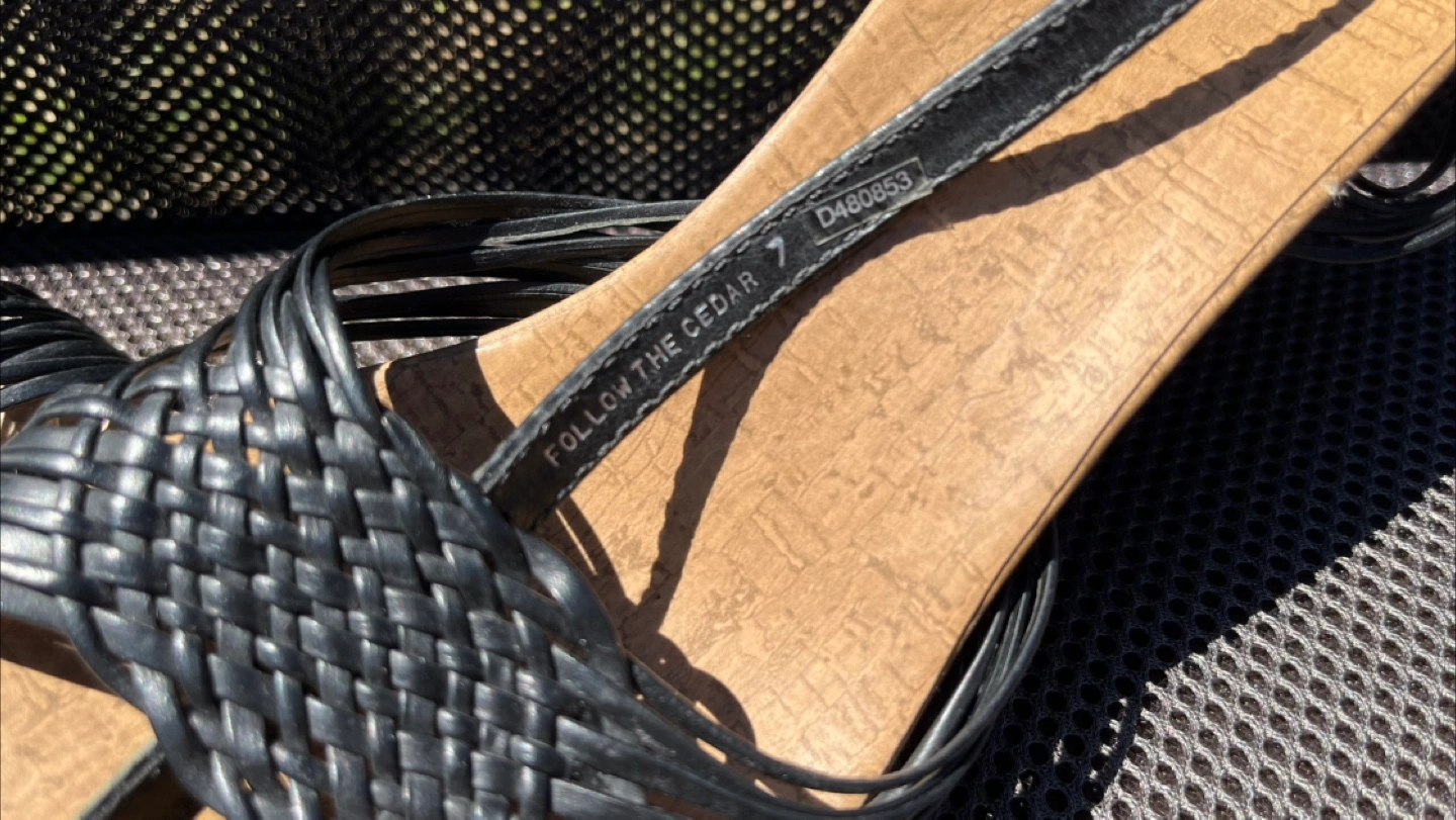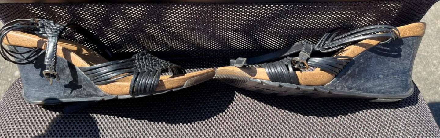 My wife says these open toe apple cedar wood wedges with straps go great with summer dresses or shorts and I agree. Even though the wood looks ‘tough’, they’re quite soft. Made in Brazil with leather upper, clean all around and ready for a night (or day) on the town. Hardly worn and you can tell by the condition of the durable rubber outsole. Size 7.