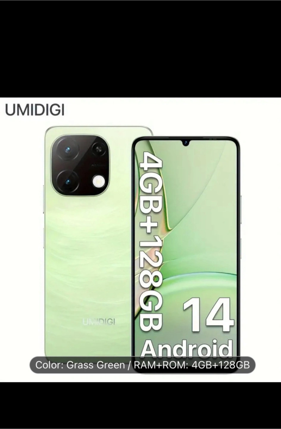 Selling a UMIDIGI G9T in grass green. It has 4GB of RAM and 128GB of storage. The phone features a 13MP main camera and an 8MP front camera. It also has a 6.75" HD+ display with a 90Hz refresh rate.