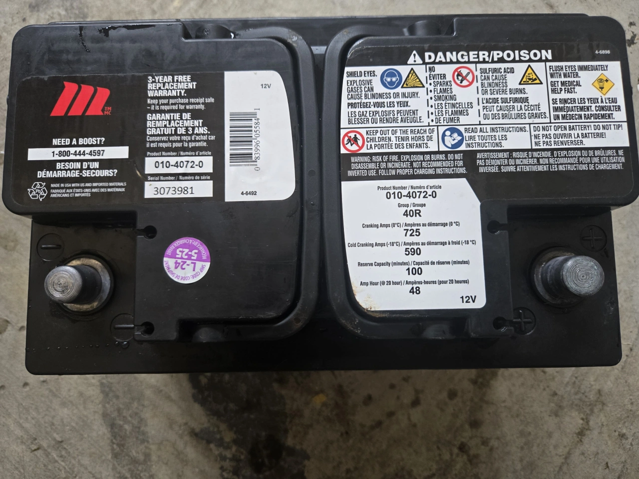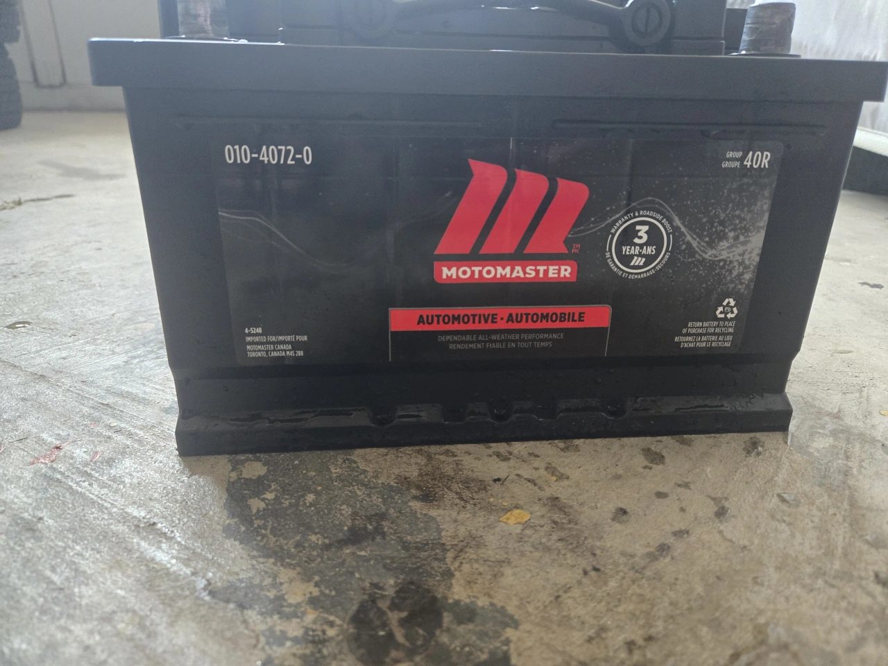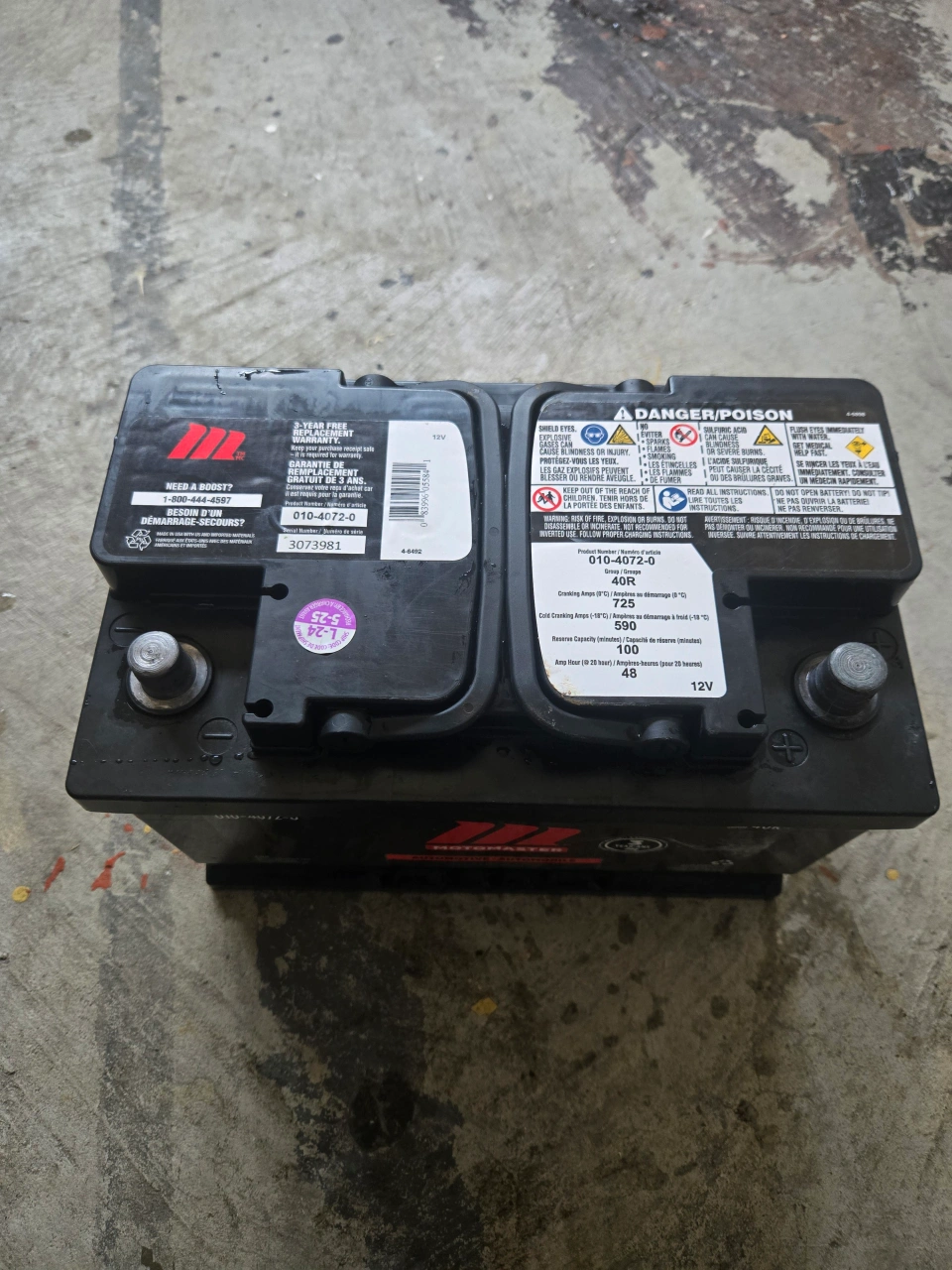Selling a Motomaster Automotive Battery, model 010-4072-0. It's a 40R group size battery with: - Cranking Amps (0°C) / Ampères au démarrage (0 °C): 725 - Cold Cranking Amps (-18°C) / Ampères au démarrage à froid (-18 °C): 590 - Reserve Capacity (minutes) / Capacité de réserve (minutes): 100 - Amp Hour (20 hours) / Ampère-heure (pour 20 heures): 48