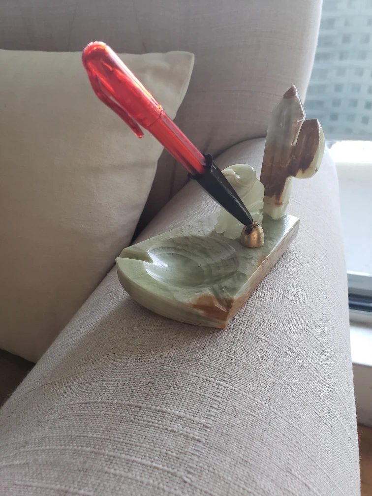 I'm selling a vintage pen holder with a pen. It features a cactus and a sombrero design, adding a touch of Southwestern charm to your desk or workspace. The holder is made of a light green stone, possibly marble or onyx. It's a unique and decorative piece!