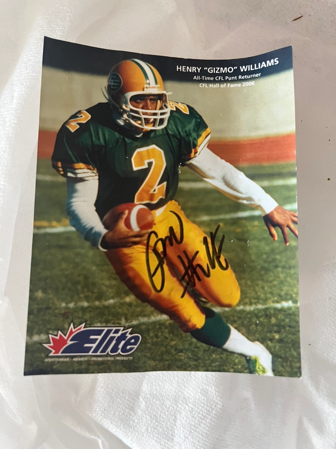 Selling an autographed photo of Henry "Gizmo" Williams, the All-Time CFL Punt Returner and CFL Hall of Fame 2006 inductee! The photo features the Elite sportswear logo.