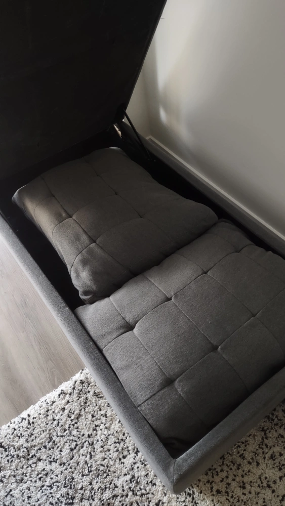 Selling a grey storage ottoman bench with two large cushions inside. It's in good condition and provides extra seating and storage space. Marker stains on the top on one side could be cleaned off, covered with the cushions or reupholstered. Perfect for your living room or bedroom!