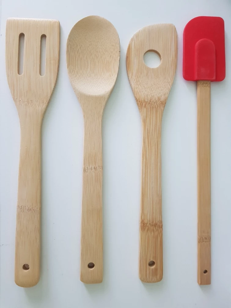 Selling a set of four kitchen utensils! The set includes a slotted spatula, a spoon, a spatula with a hole, and a red silicone spatula. All are made of wood and are in new condition, ready for your kitchen!