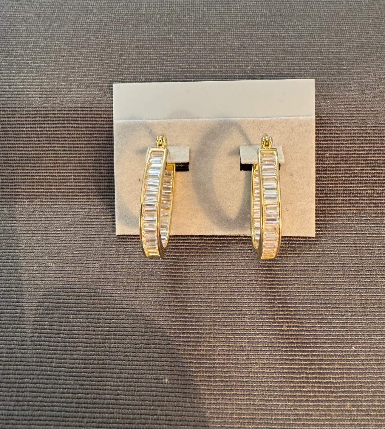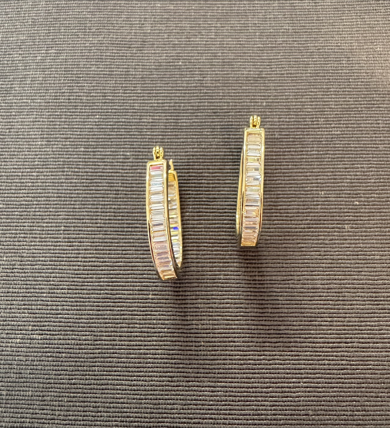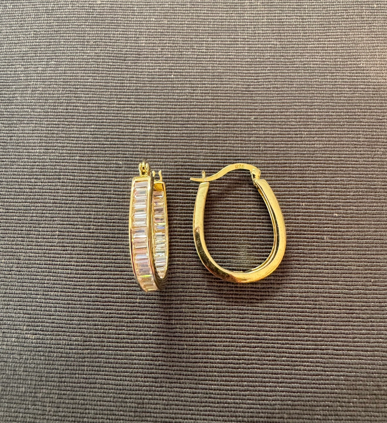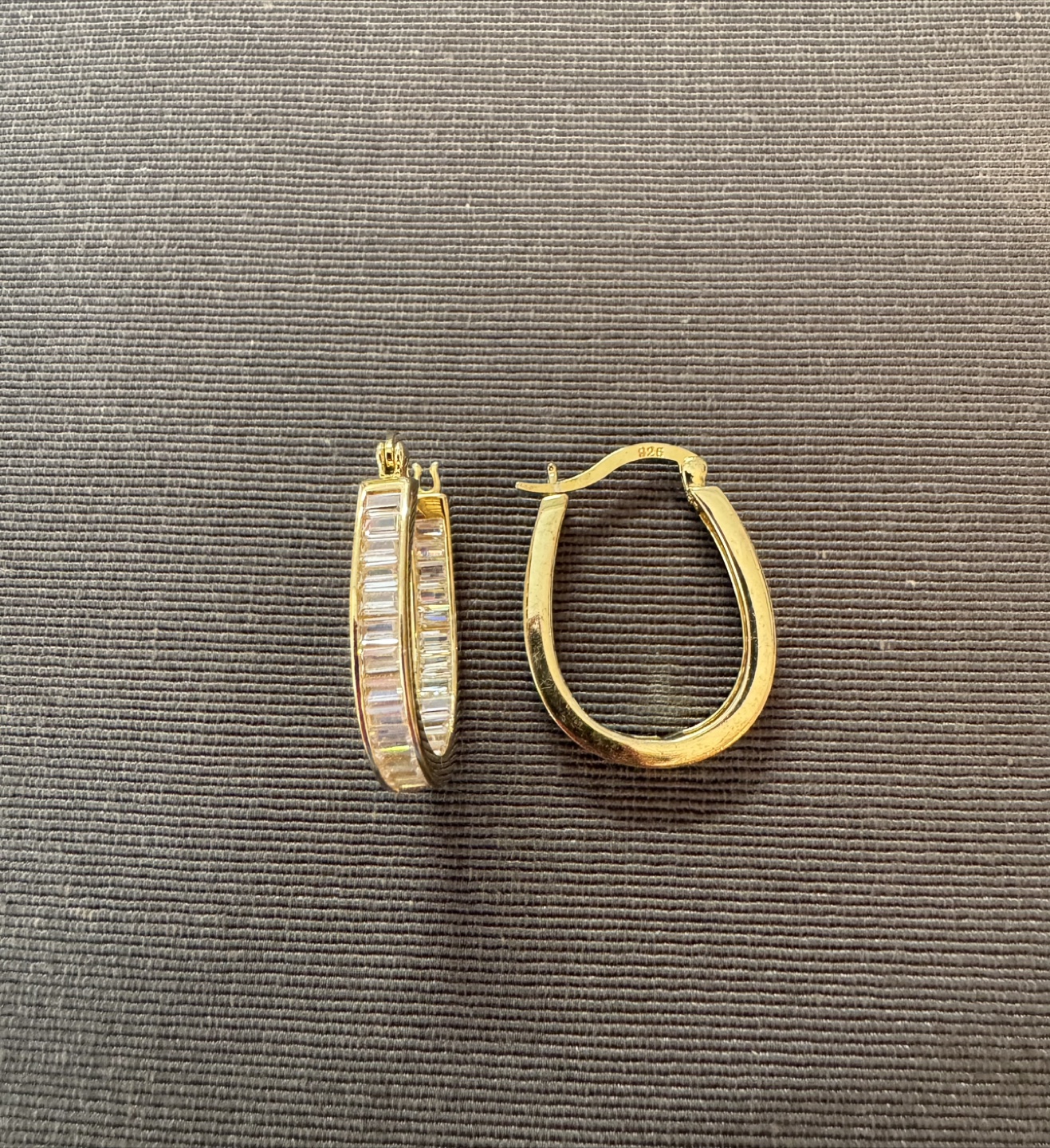 Selling a pair of 14k Gold over 925 Sterling Silver hoop earrings featuring clear Cubic Zirconia stones in a Baguette shape. The earrings are marked with the Sterling brand and are designed in an oval shape, creating a stylish and elegant look. The 14K Gold plating c adds uxury to the fashion jewelry, making it a beautiful accessory for any outfit.