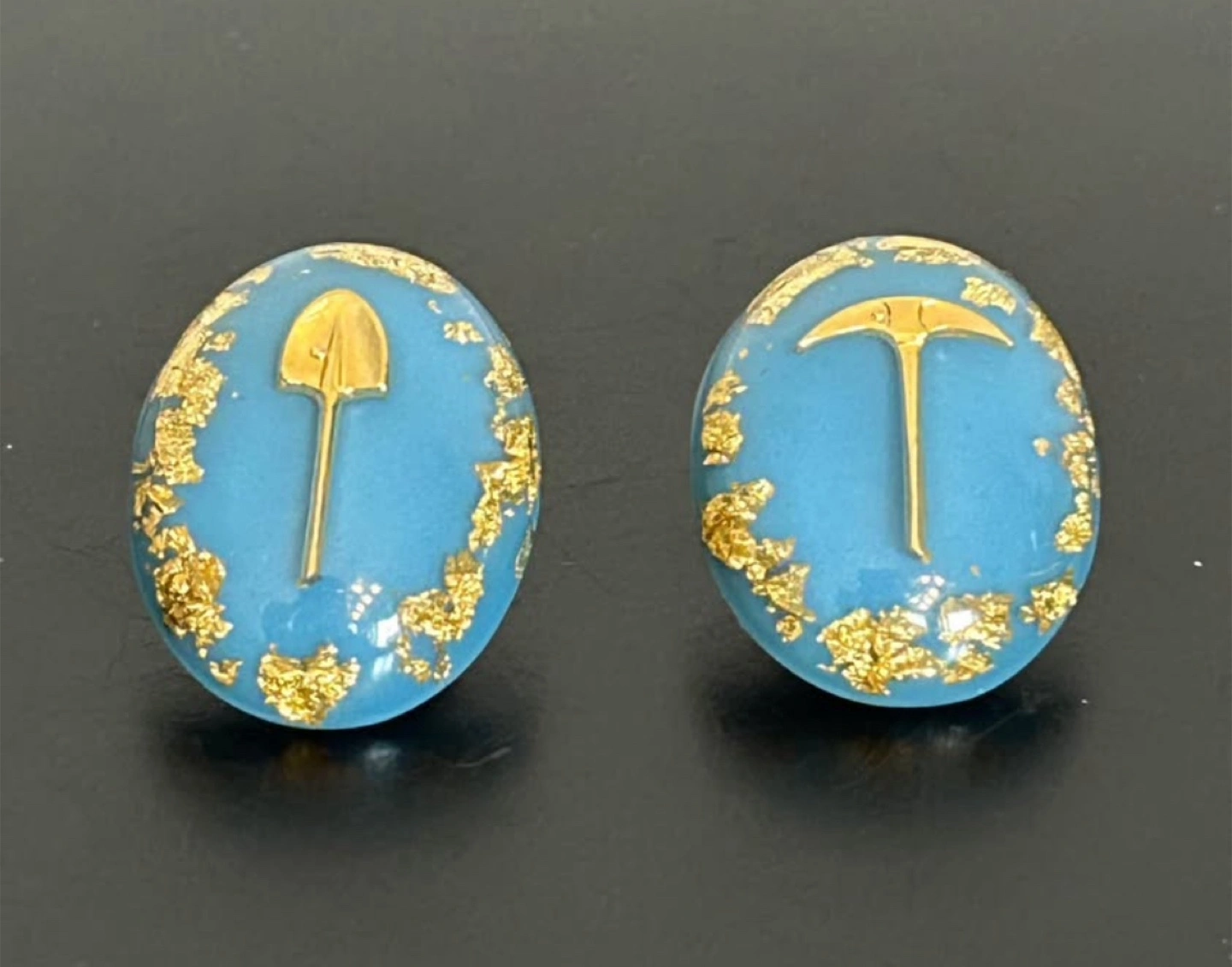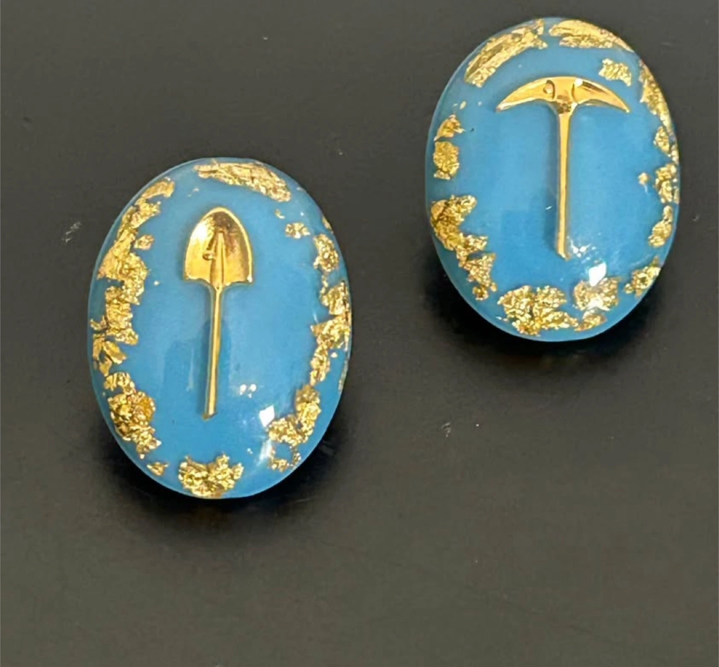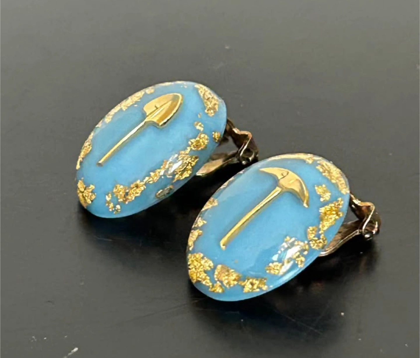 Unique vintage clip-on earrings featuring a mining theme with a gold-tone pickaxe and shovel embedded in sky-blue resin. Accented with scattered gold flakes, likely a souvenir piece from Alaska or Yukon. Oval shape with secure clip-on backs. A nostalgic piece for collectors of mining memorabilia or vintage jewelry.