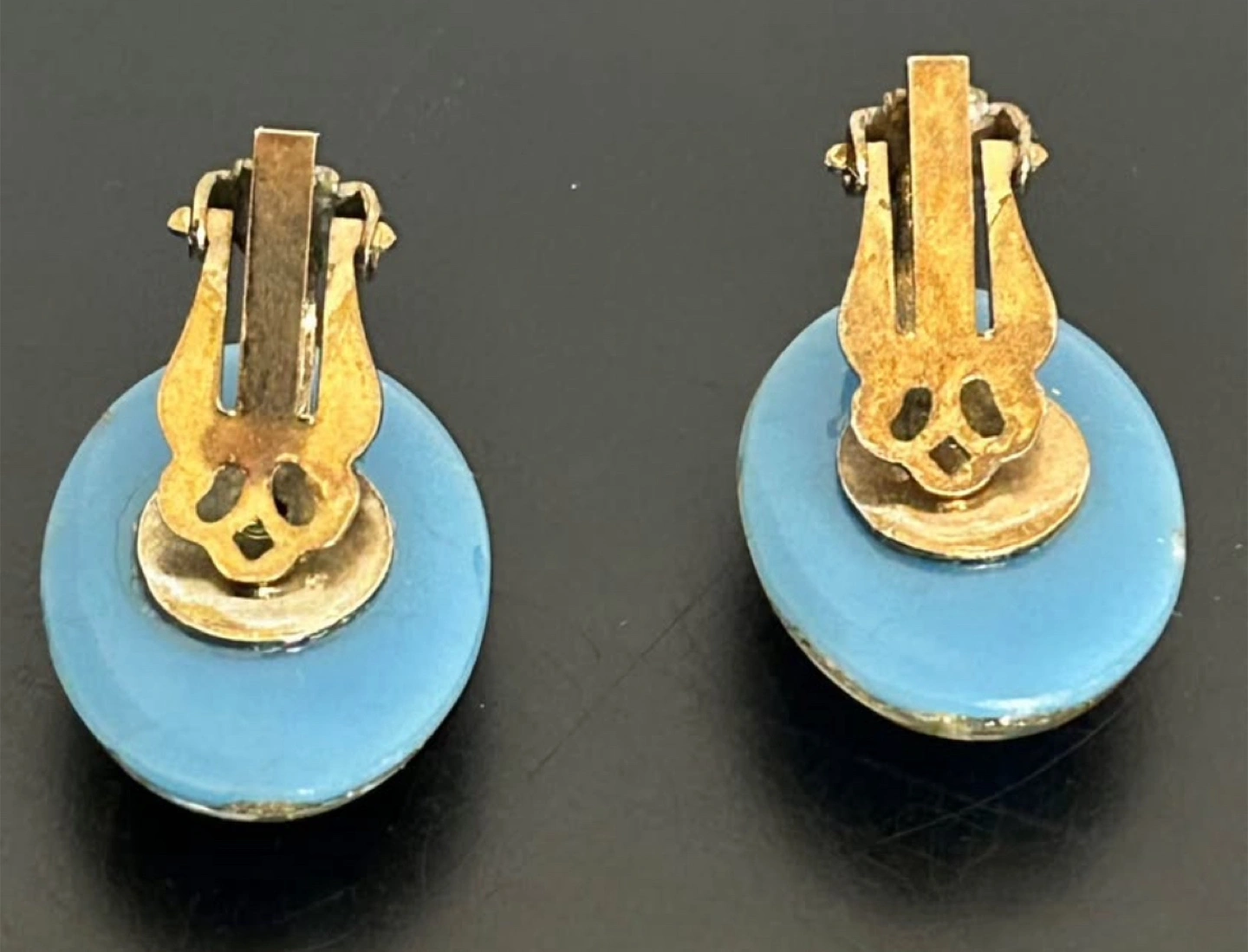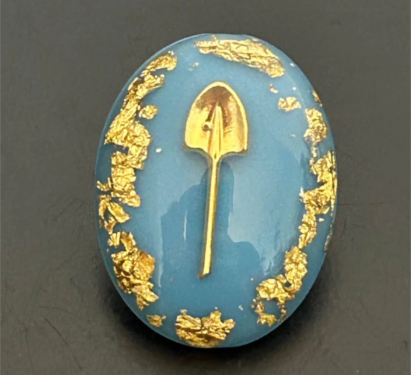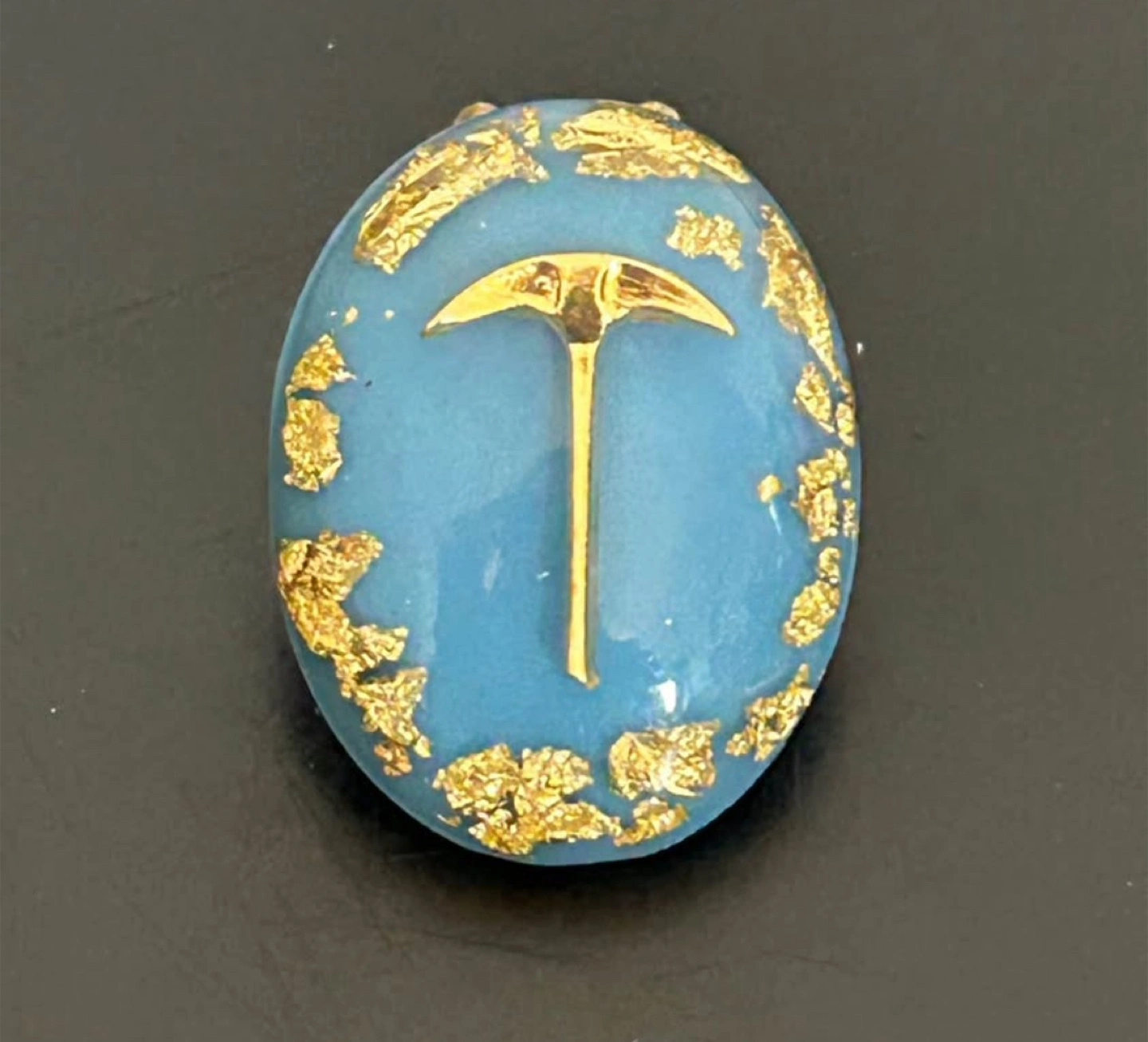 Unique vintage clip-on earrings featuring a mining theme with a gold-tone pickaxe and shovel embedded in sky-blue resin. Accented with scattered gold flakes, likely a souvenir piece from Alaska or Yukon. Oval shape with secure clip-on backs. A nostalgic piece for collectors of mining memorabilia or vintage jewelry.