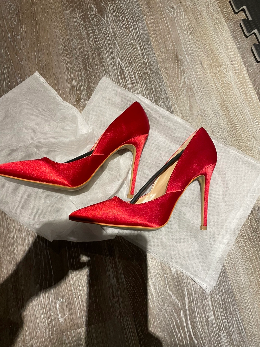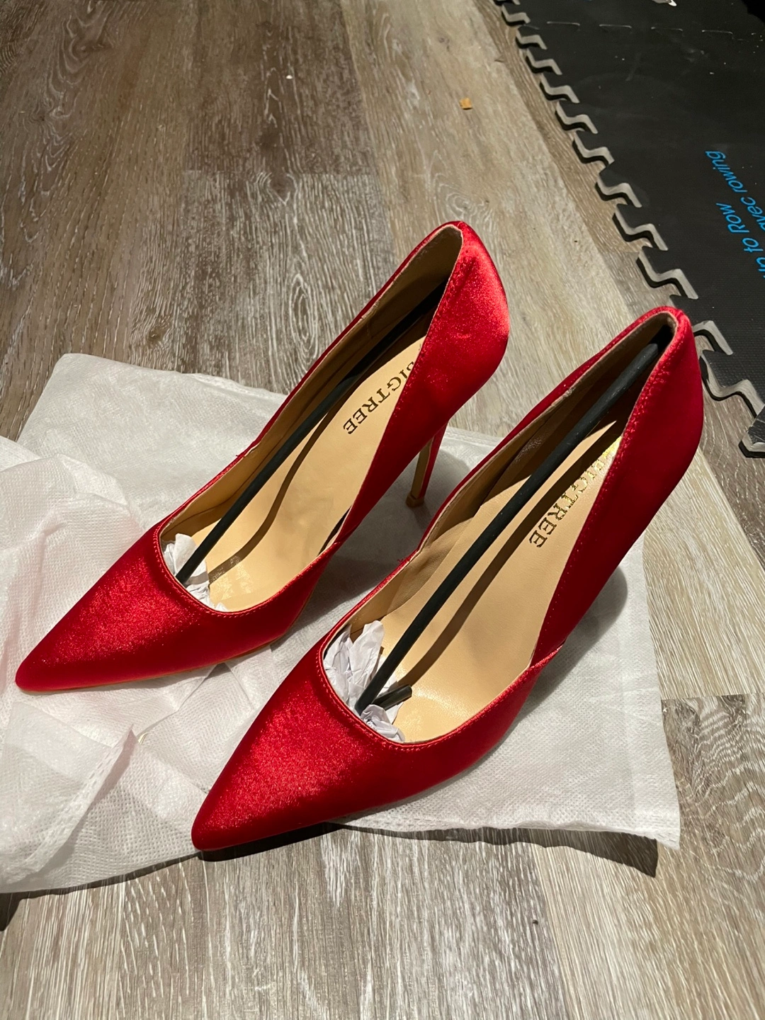 These beautiful red heels are from BIGTREE and are a size 37 (equivalent to a US size 7). They're perfect for a night out or a special occasion! The material is a smooth, shiny fabric.