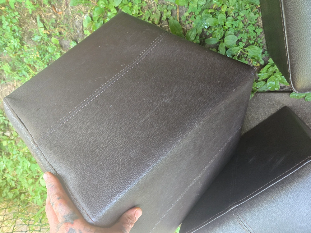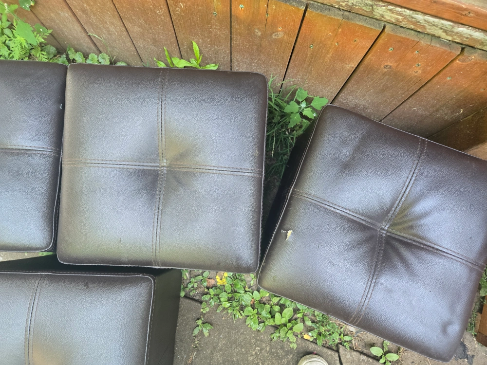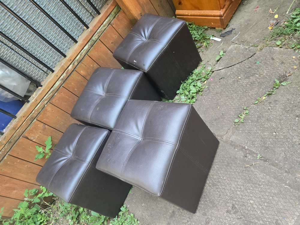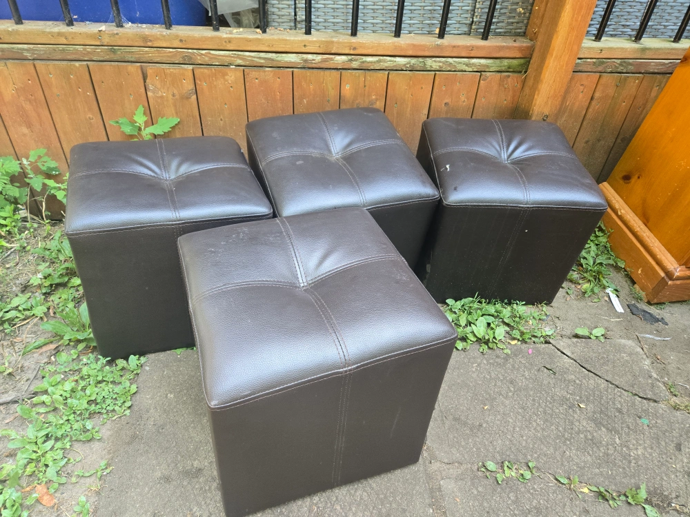 Selling a set of four brown faux leather ottomans. They show some signs of wear, as you can see in the photos, but they're still quite functional and comfy! Perfect for adding extra seating or as footrests in your living room or den