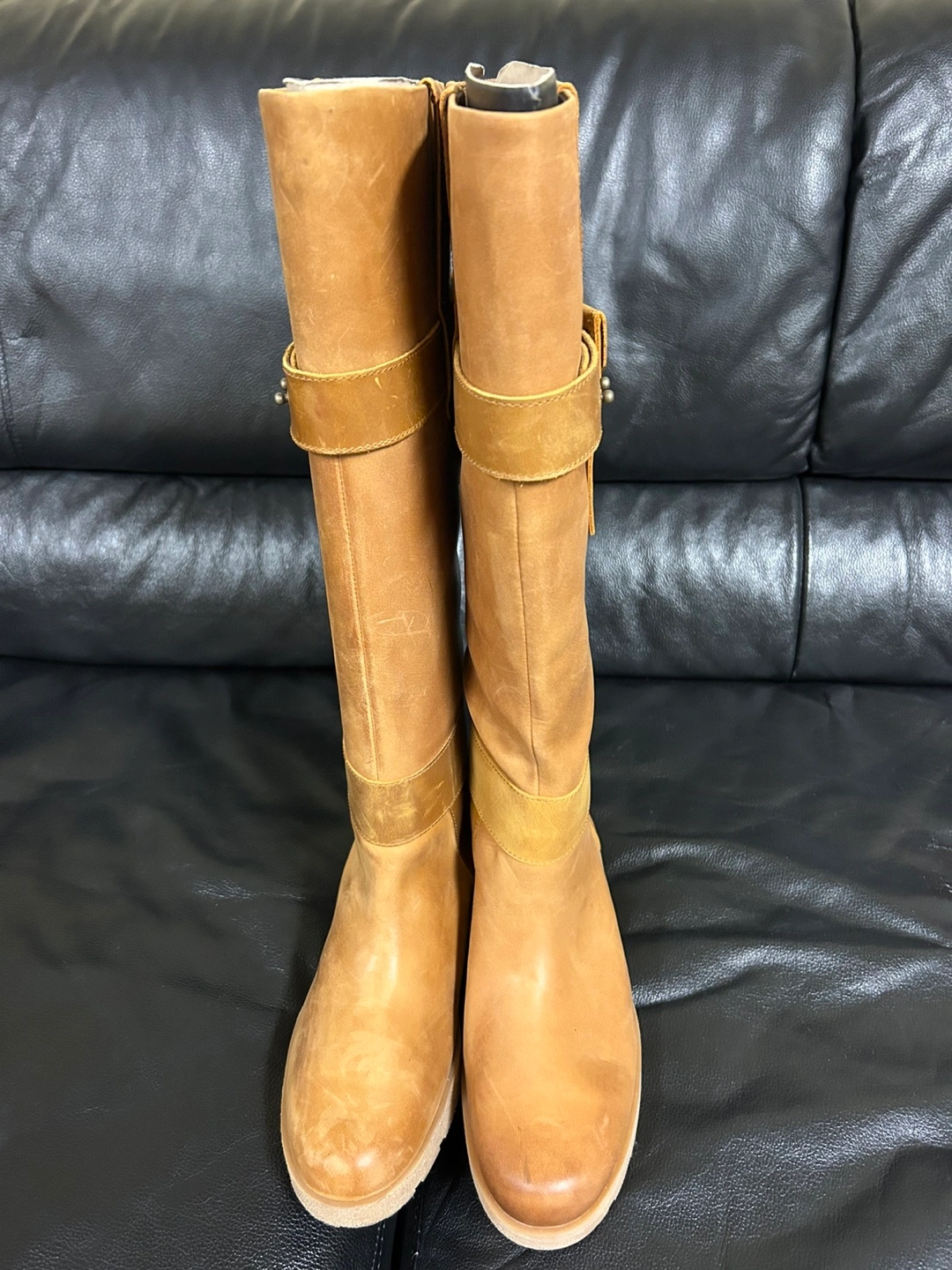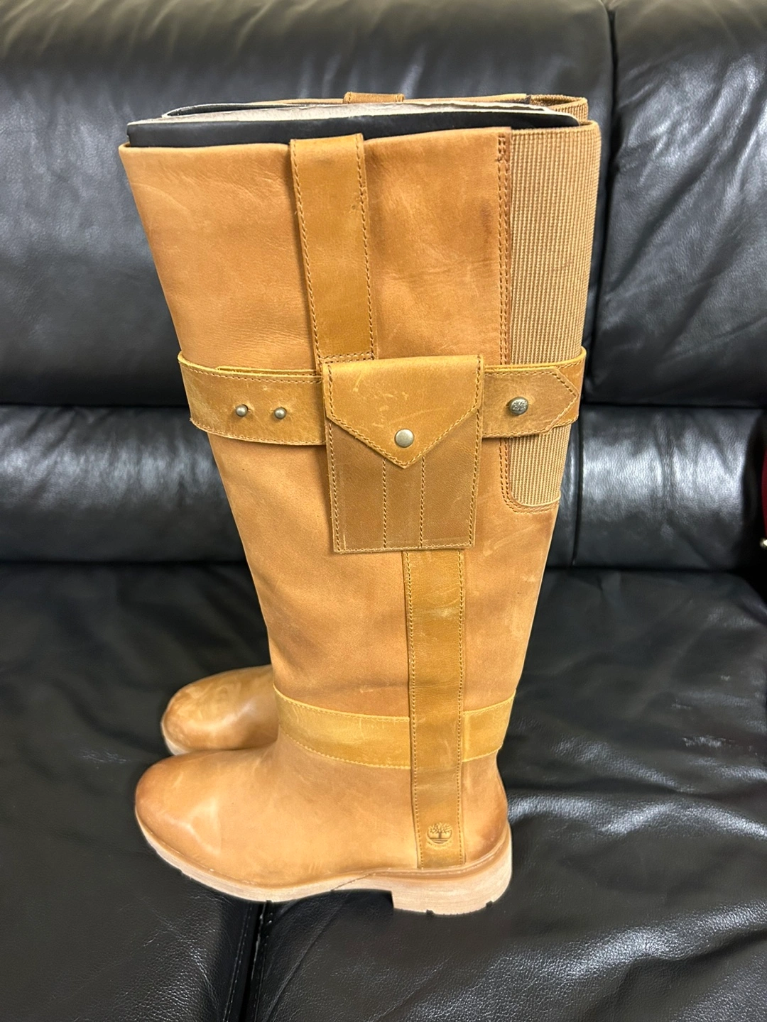 These are a pair of Timberland knee-high boots in a lovely tan leather. They're in great condition and ready for a new home. Perfect for adding a touch of style to your fall or winter outfits!