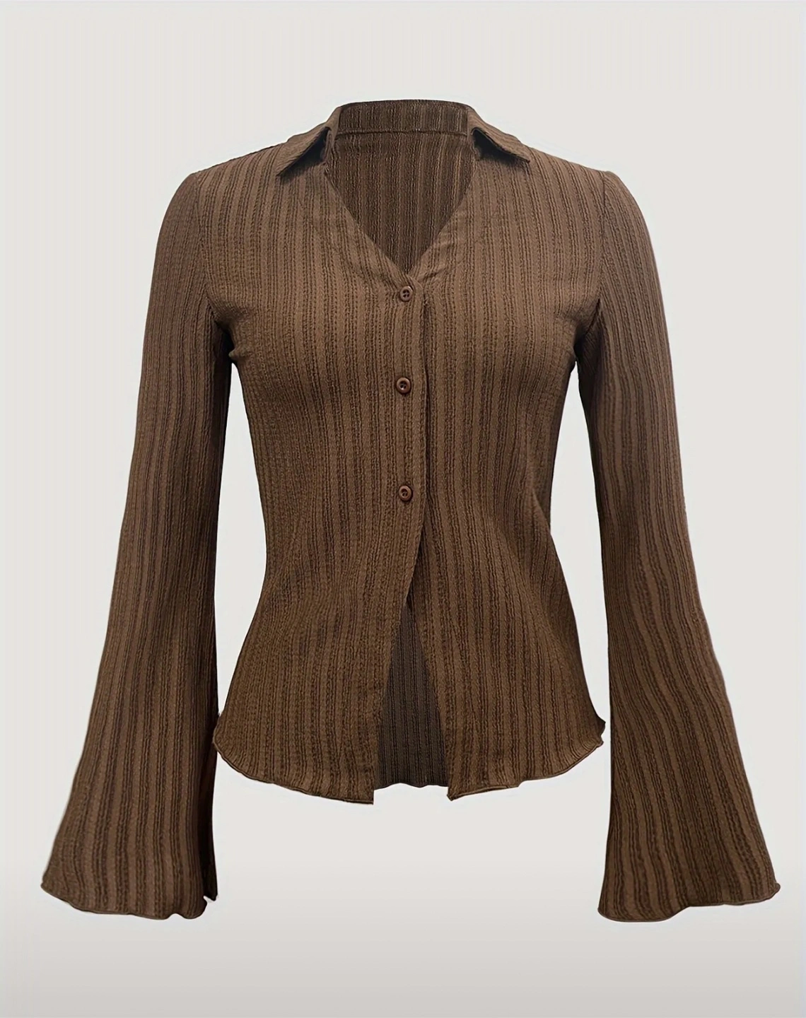 Here's a cute brown knit top with a button-up front. It has a unique texture and flared sleeves that add a touch of flair to any outfit. Perfect for layering or wearing on its own!