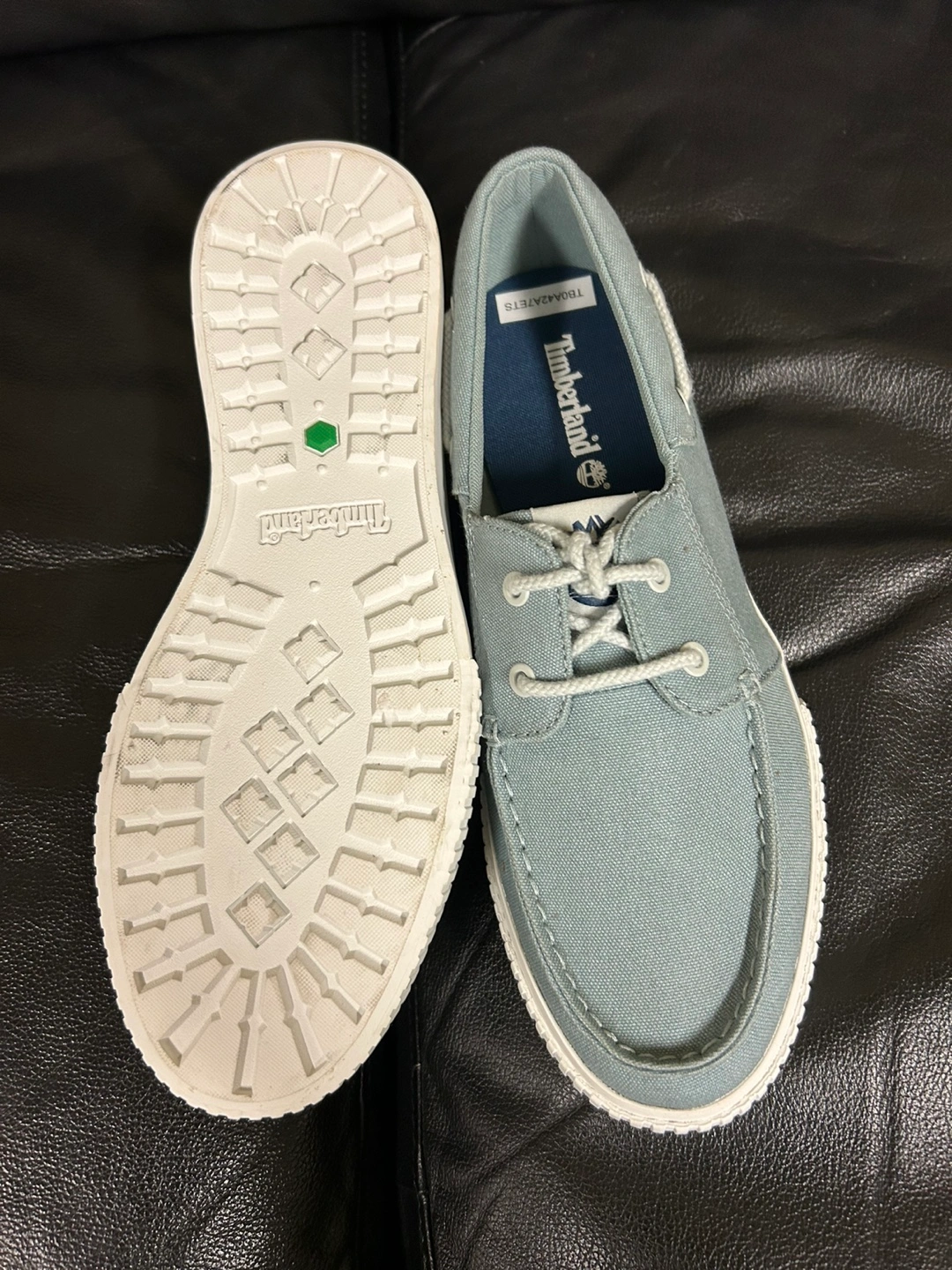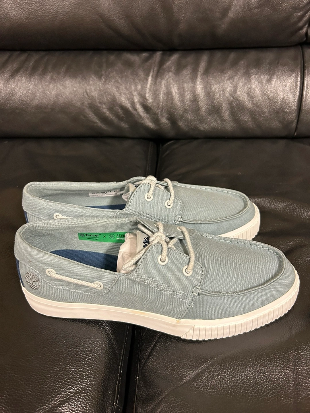 These Timberland boat shoes are in great condition and ready for a new home! They feature a light blue canvas upper and a classic boat shoe design. Perfect for casual wear or a day on the water! The soles are white and sturdy, offering good traction.