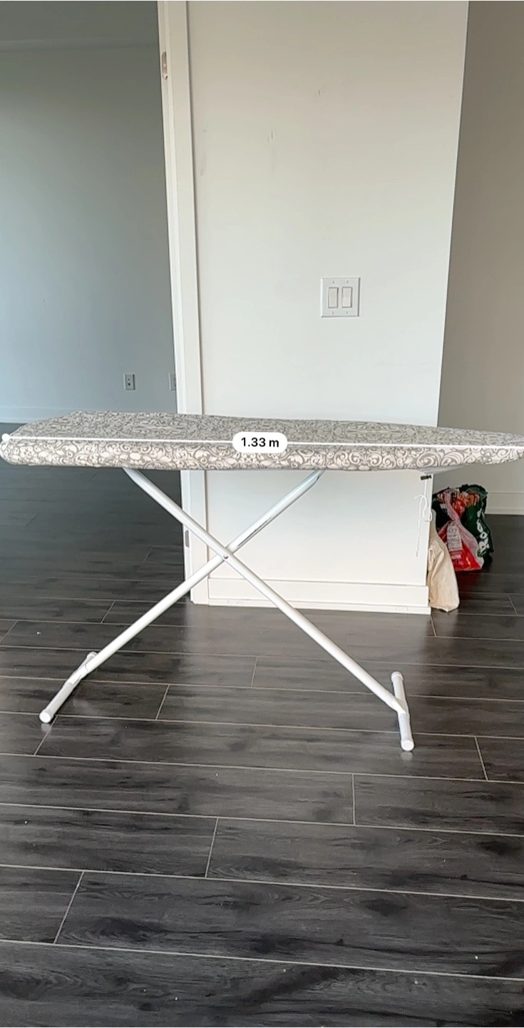 Sturdy ironing board about 1.33 meters long. It's in good condition and comes with a thick padded cover. Height adjustable. Need item gone by Thursday, Aug. 14.