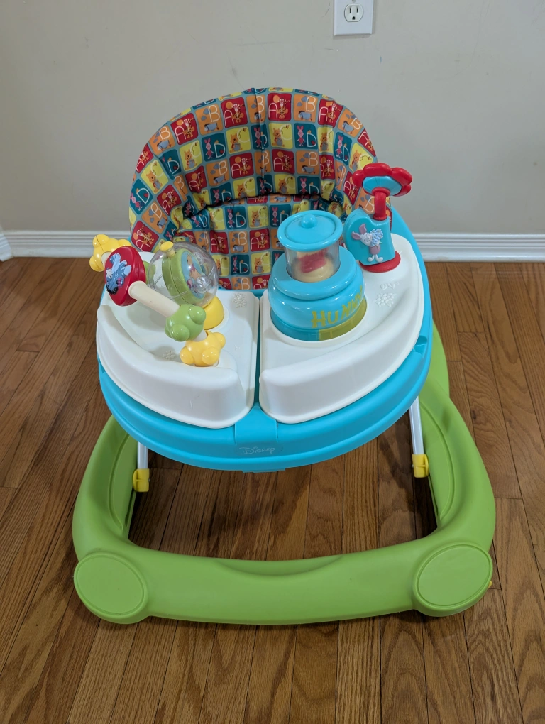 Selling a Disney walker with tray that move out if you want to give snacks have 3 seat adjustments! It features a Winnie the Pooh themed seat and a fun activity center. Perfect for your little one to explore and learn to walk