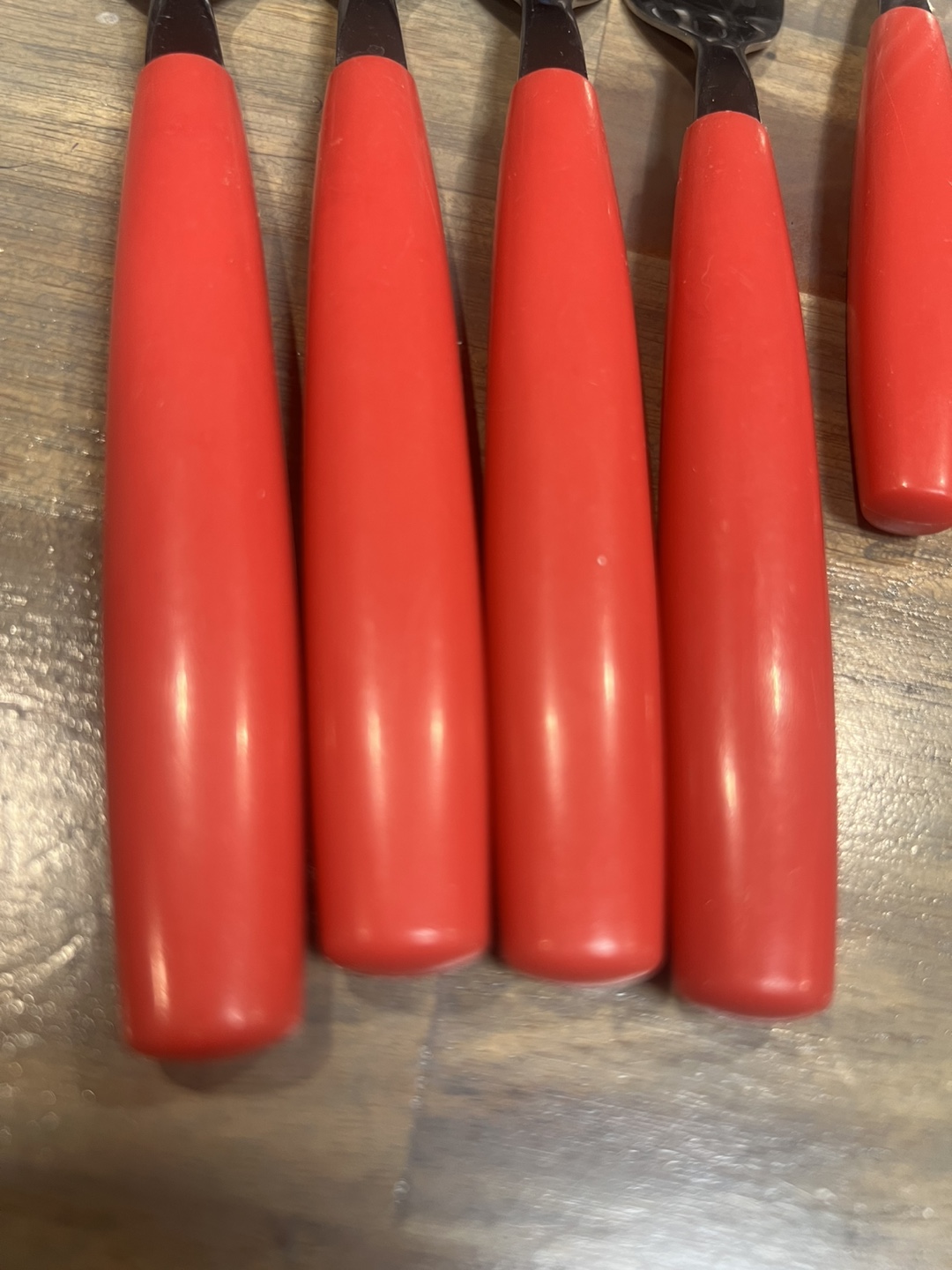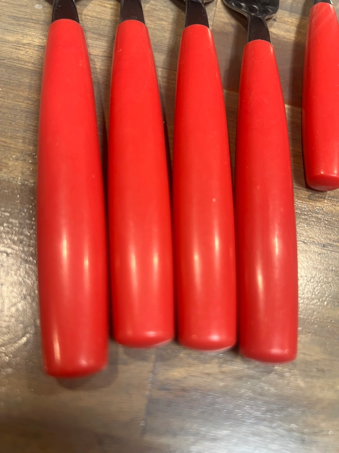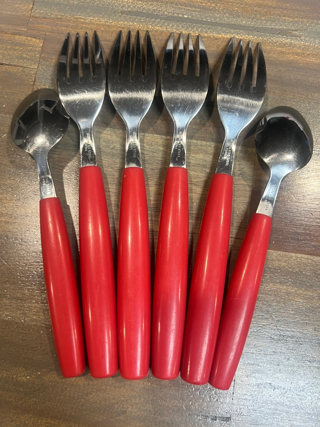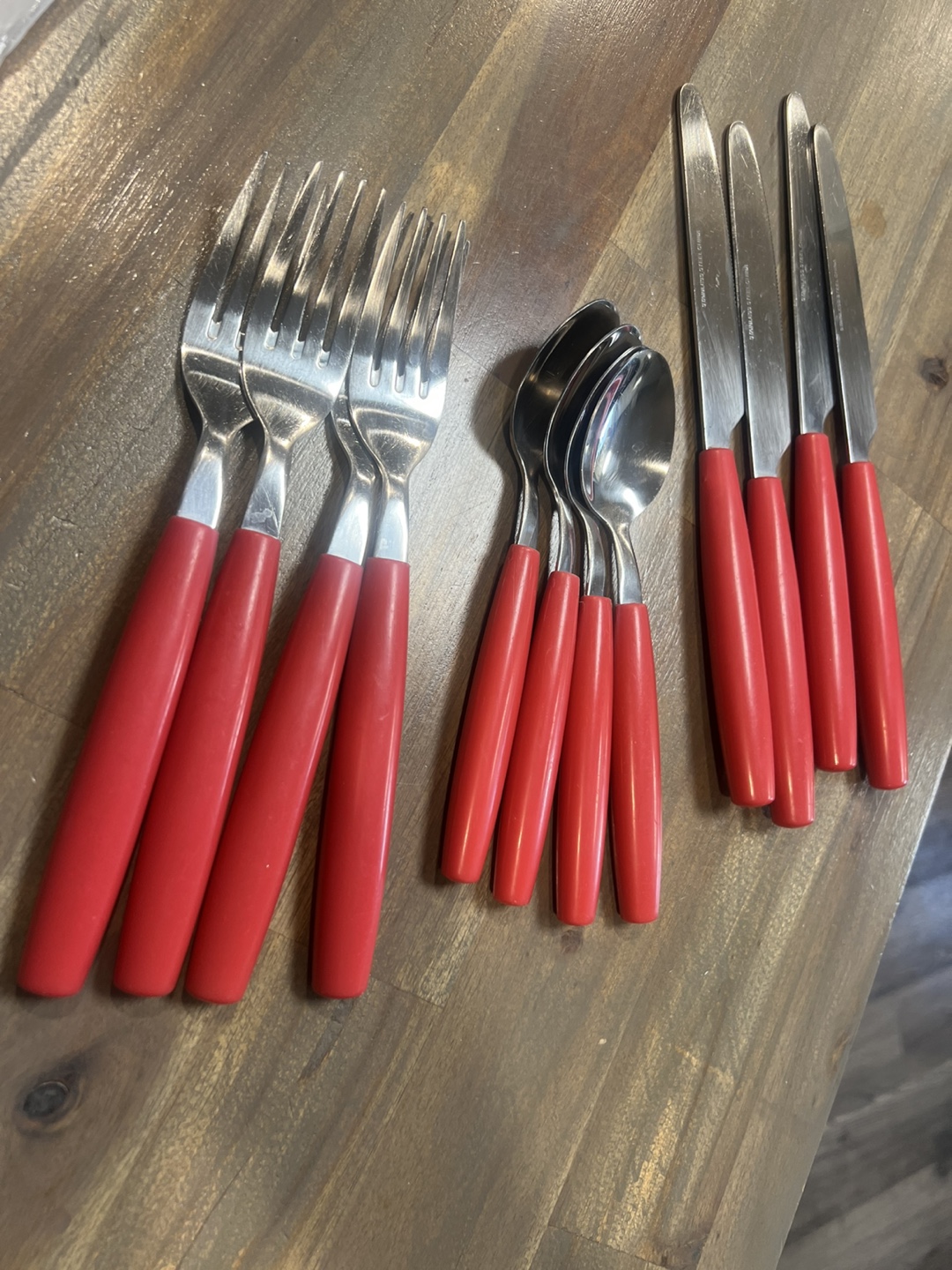 12 piece set of vintage stainless steel cutlery. This set includes forks, spoons, and knives, all with bright red handles. They're in great shape and ready for a new home. Perfect for adding a pop of colour to your table. PICK UP LOCATION: Marlborough.