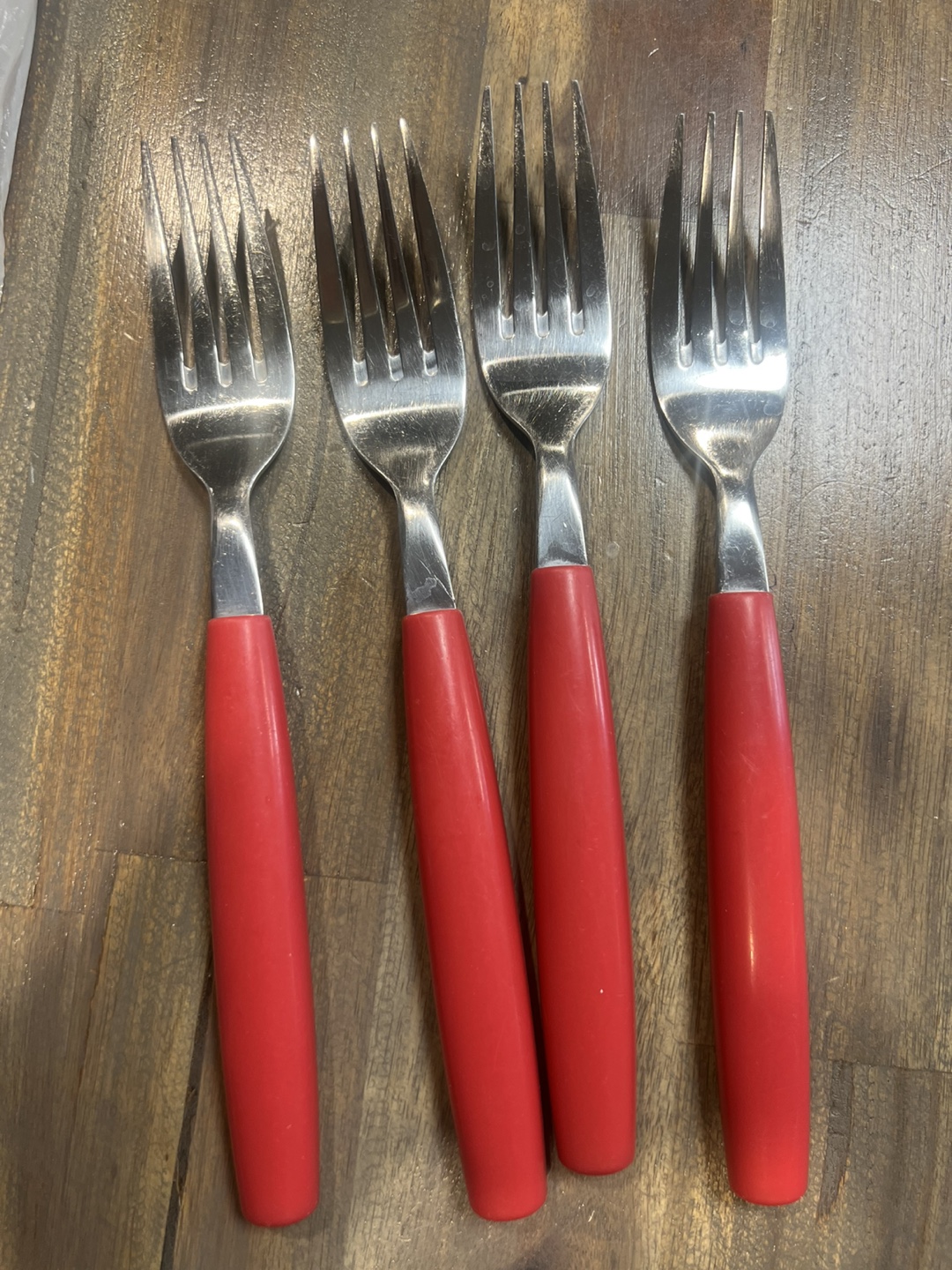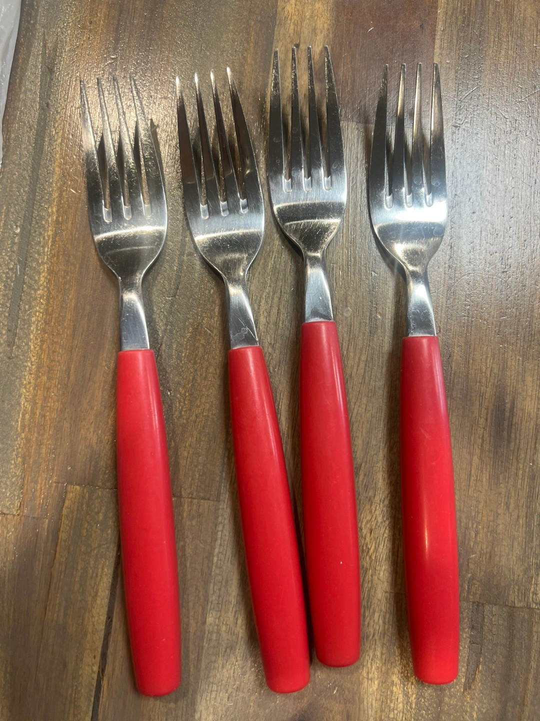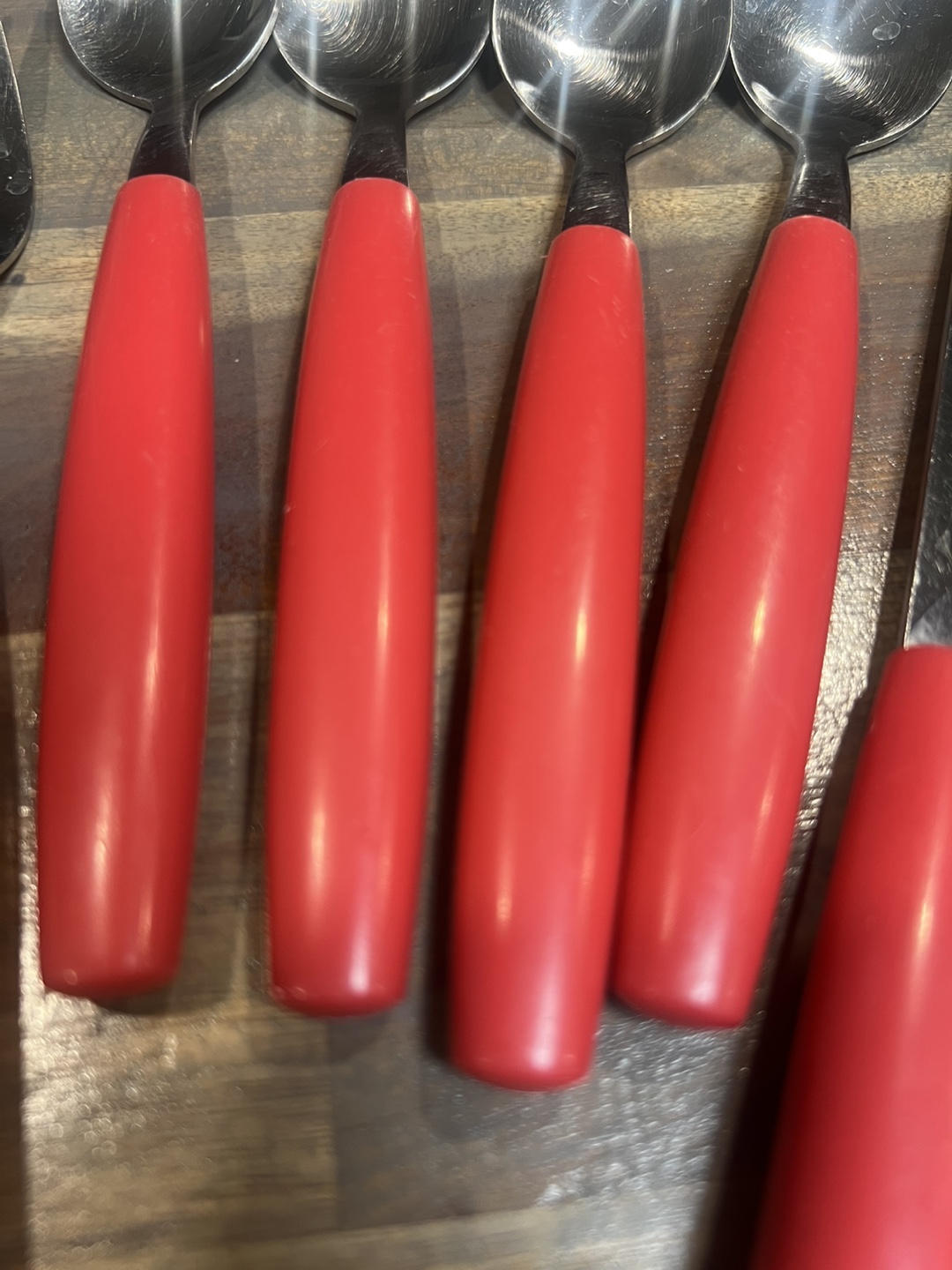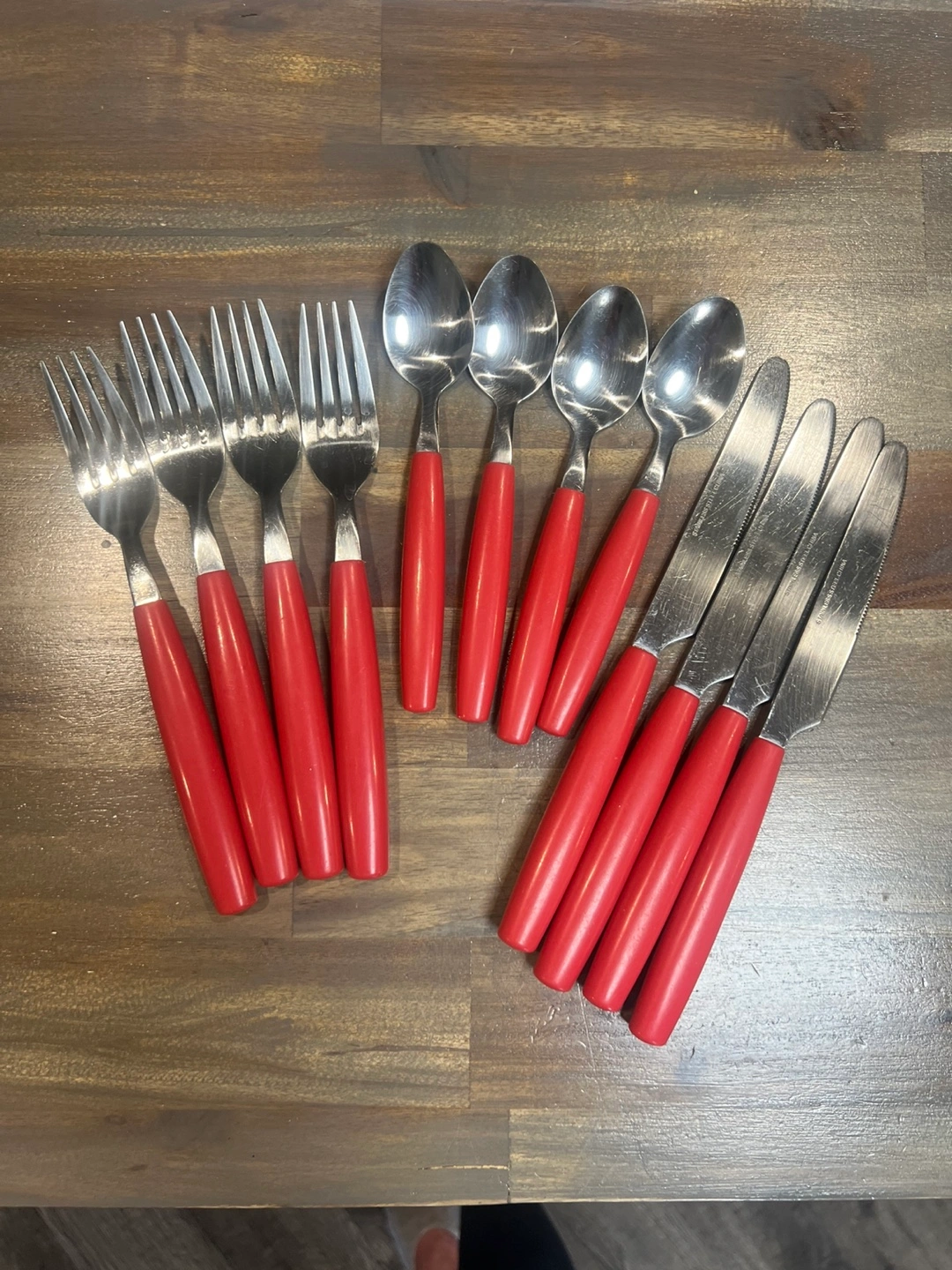 12 piece set of vintage stainless steel cutlery. This set includes forks, spoons, and knives, all with bright red handles. They're in great shape and ready for a new home. Perfect for adding a pop of colour to your table. PICK UP LOCATION: Marlborough.