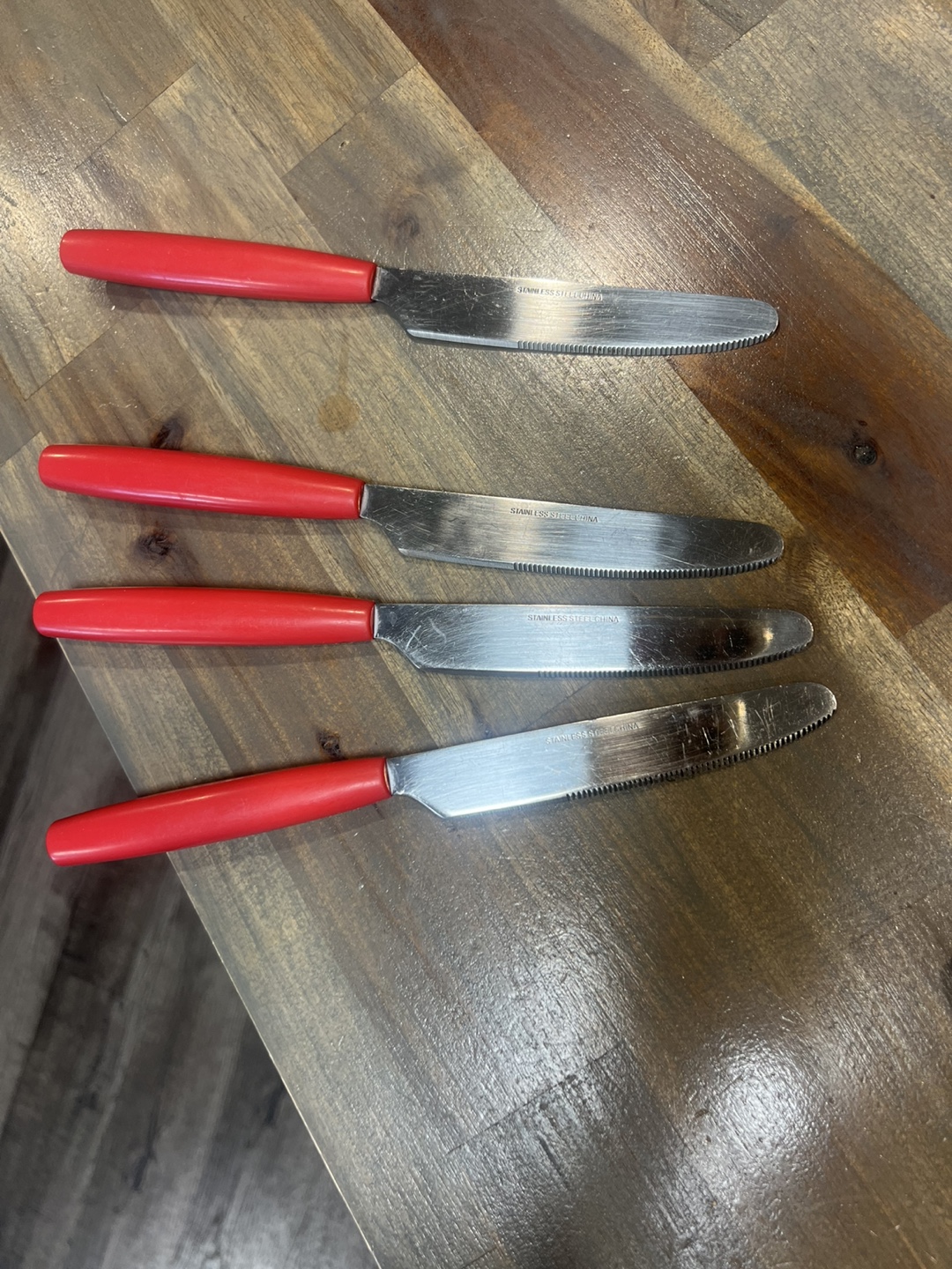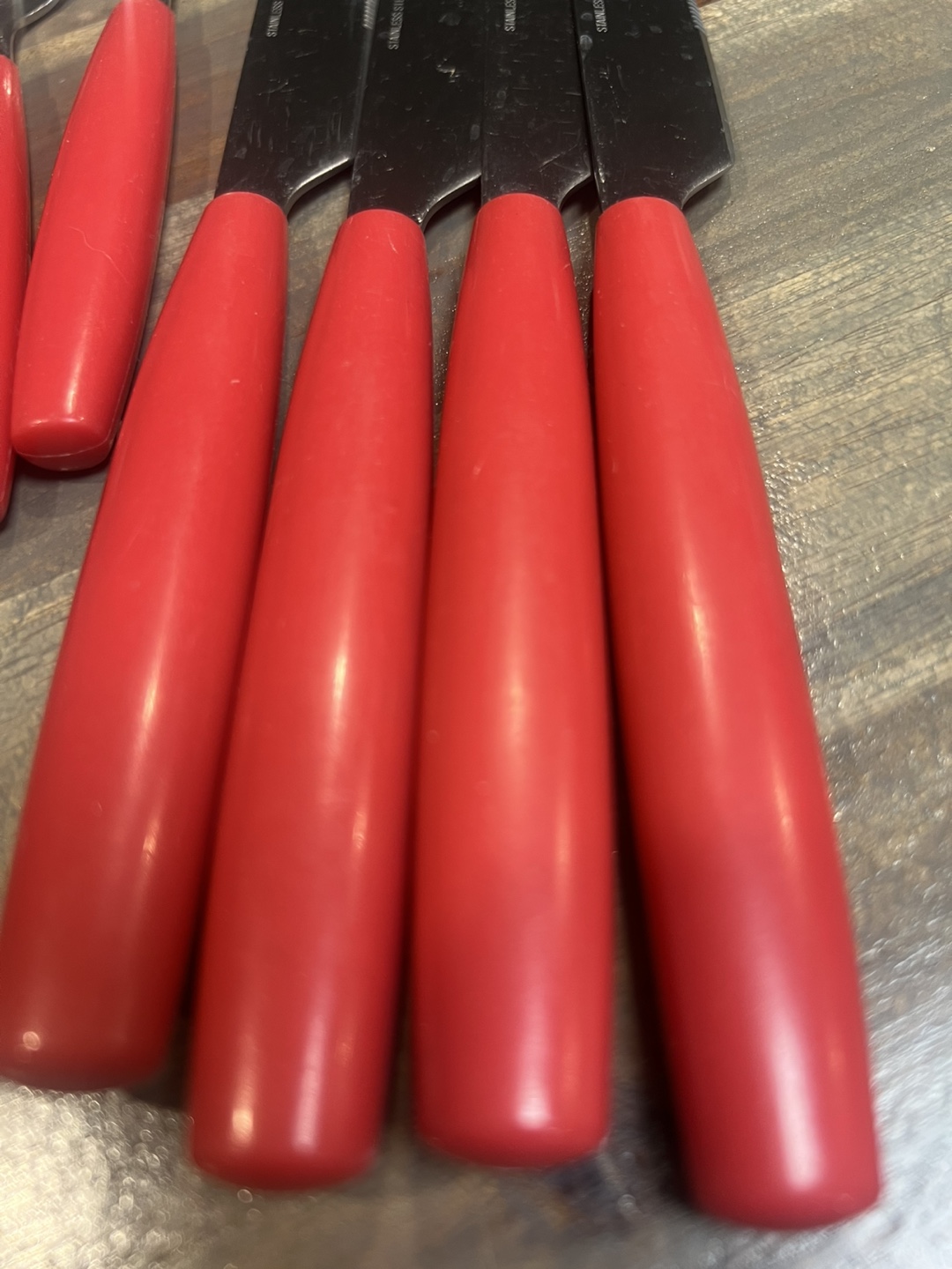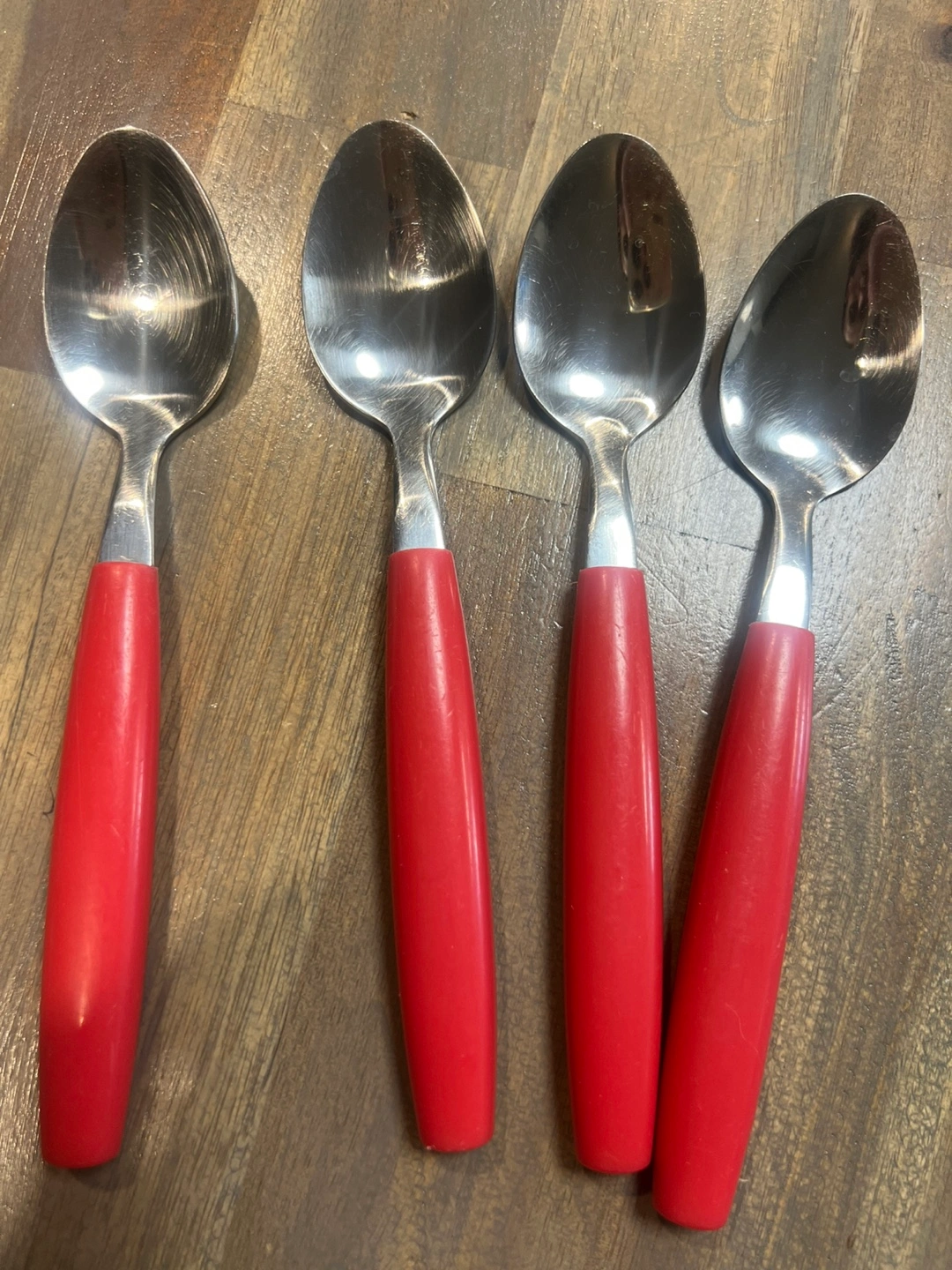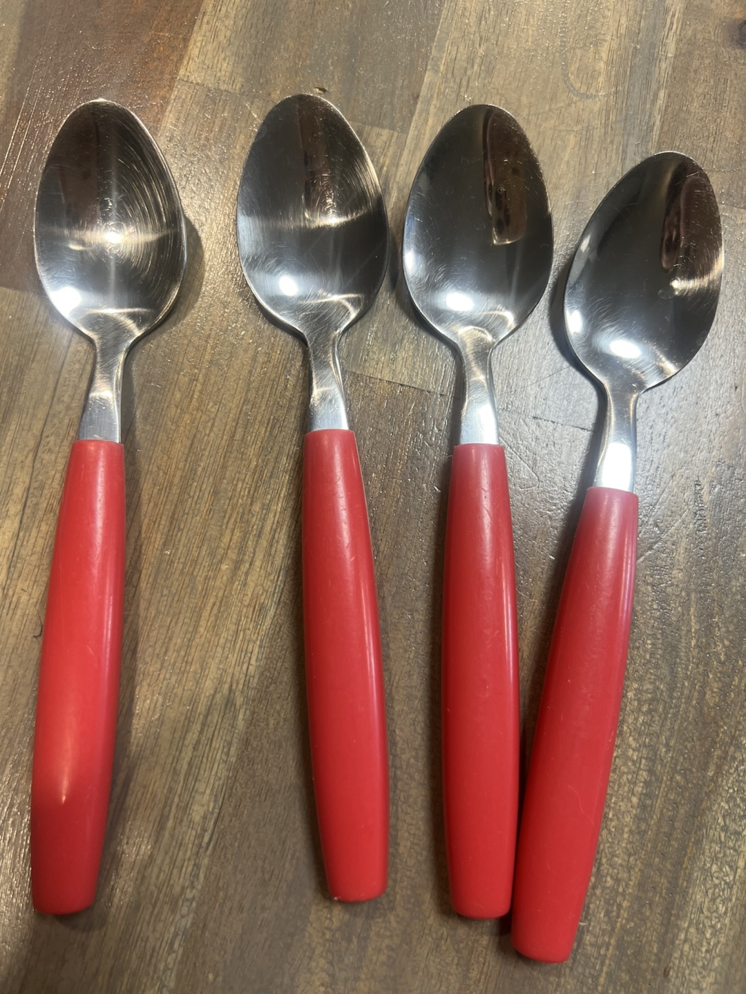 12 piece set of vintage stainless steel cutlery. This set includes forks, spoons, and knives, all with bright red handles. They're in great shape and ready for a new home. Perfect for adding a pop of colour to your table. PICK UP LOCATION: Marlborough.
