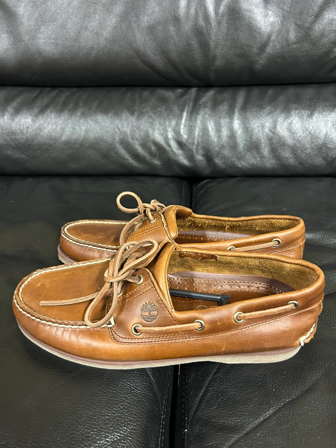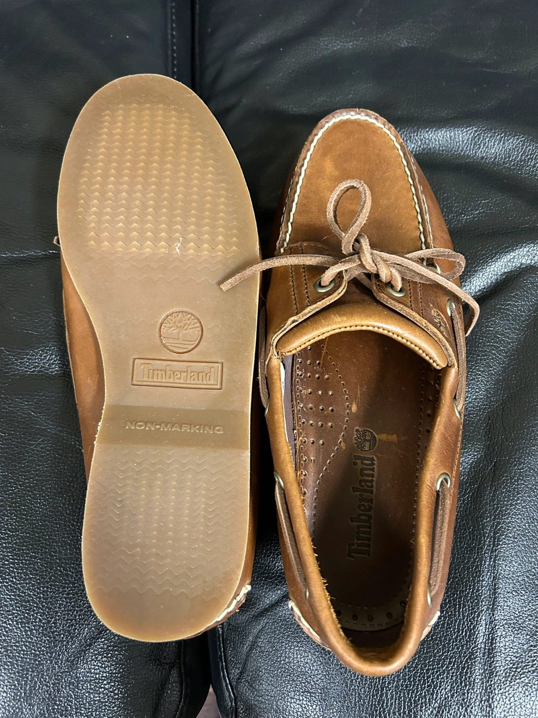 These Timberland boat shoes are a classic! They're made of brown leather and have a comfortable, non-marking sole. Perfect for everyday wear!