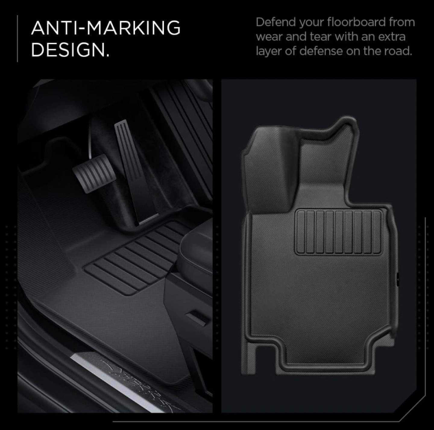 These floor mats are designed specifically for the Tesla Cybertruck. They offer all-weather defense with a waterproof liner for easy cleaning and maintenance. The grippy, non-marking, and non-slip pattern ensures secure footing on the drive. They also feature an anti-marking design to protect your floorboard from wear and tear.