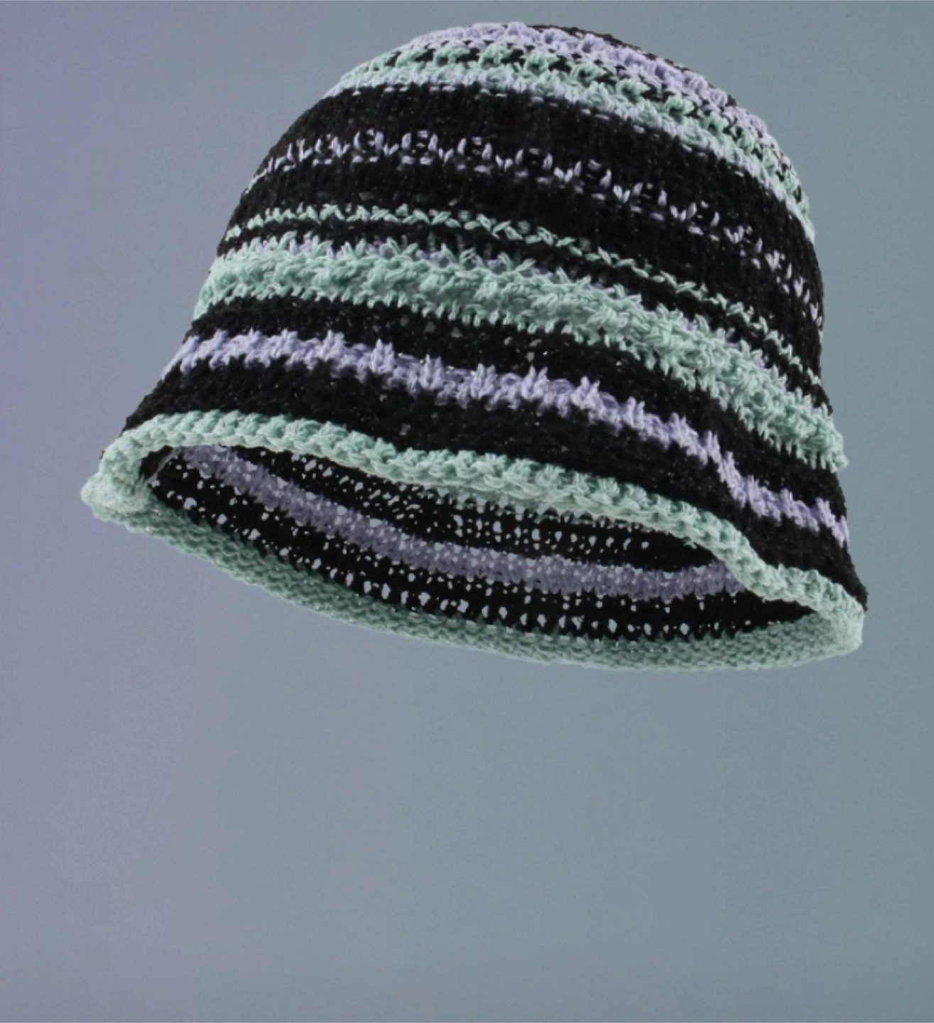 This is a cute crochet bucket hat with black, light green, and lavender stripes. It's in great condition and ready to add a pop of colour to your wardrobe!