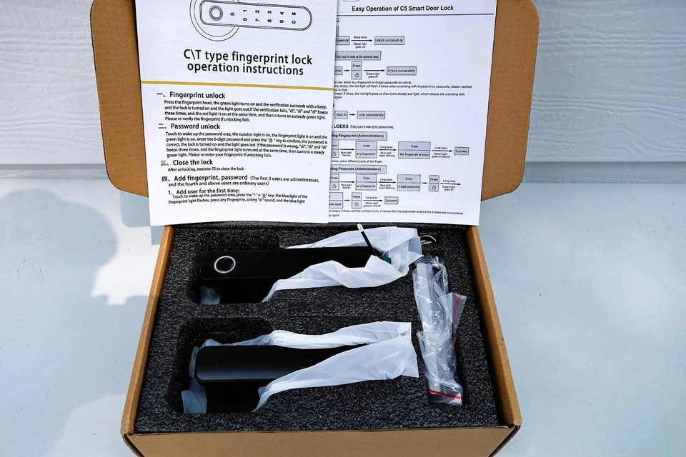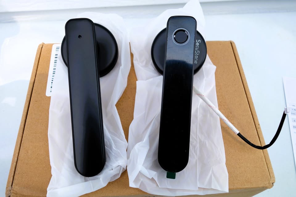 The handle can be unlocked by one of three methods: 1) fingerprint reader, 2) numeric passcode, or 3) using one of the included backup keys, which are also important to have in case the battery happens to go empty and you're locked out.