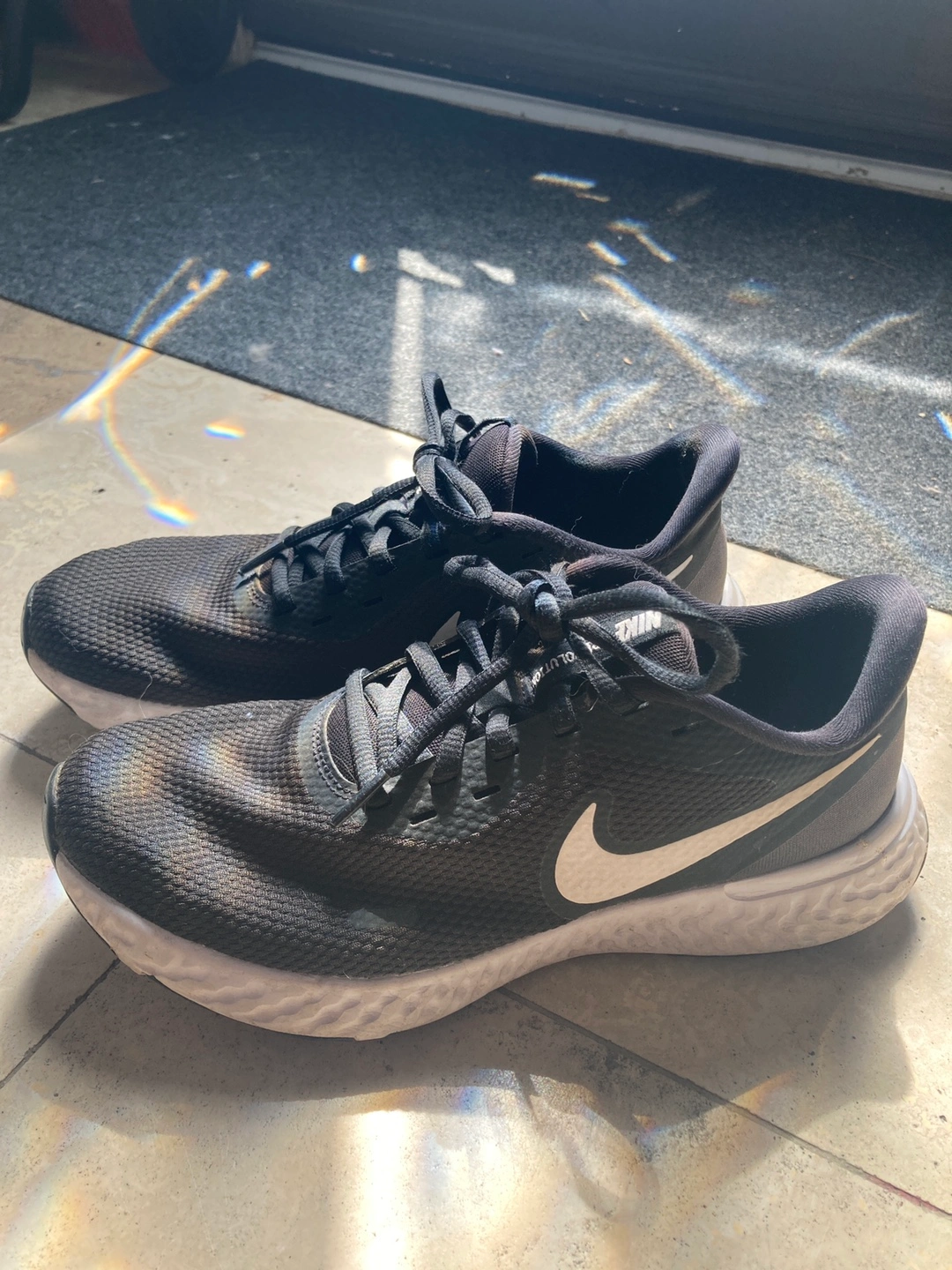 Well worn but still in good shape! Black Nike running shoes. Women’s size 8.5 Cash only please. 🙏🏻