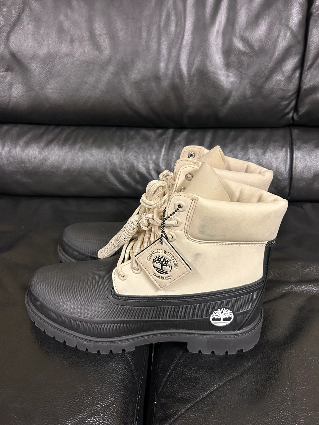 These Timberland boots are guaranteed waterproof and ready for anything! They are a stylish black and beige colour and in great condition. Perfect for the Canadian weather!