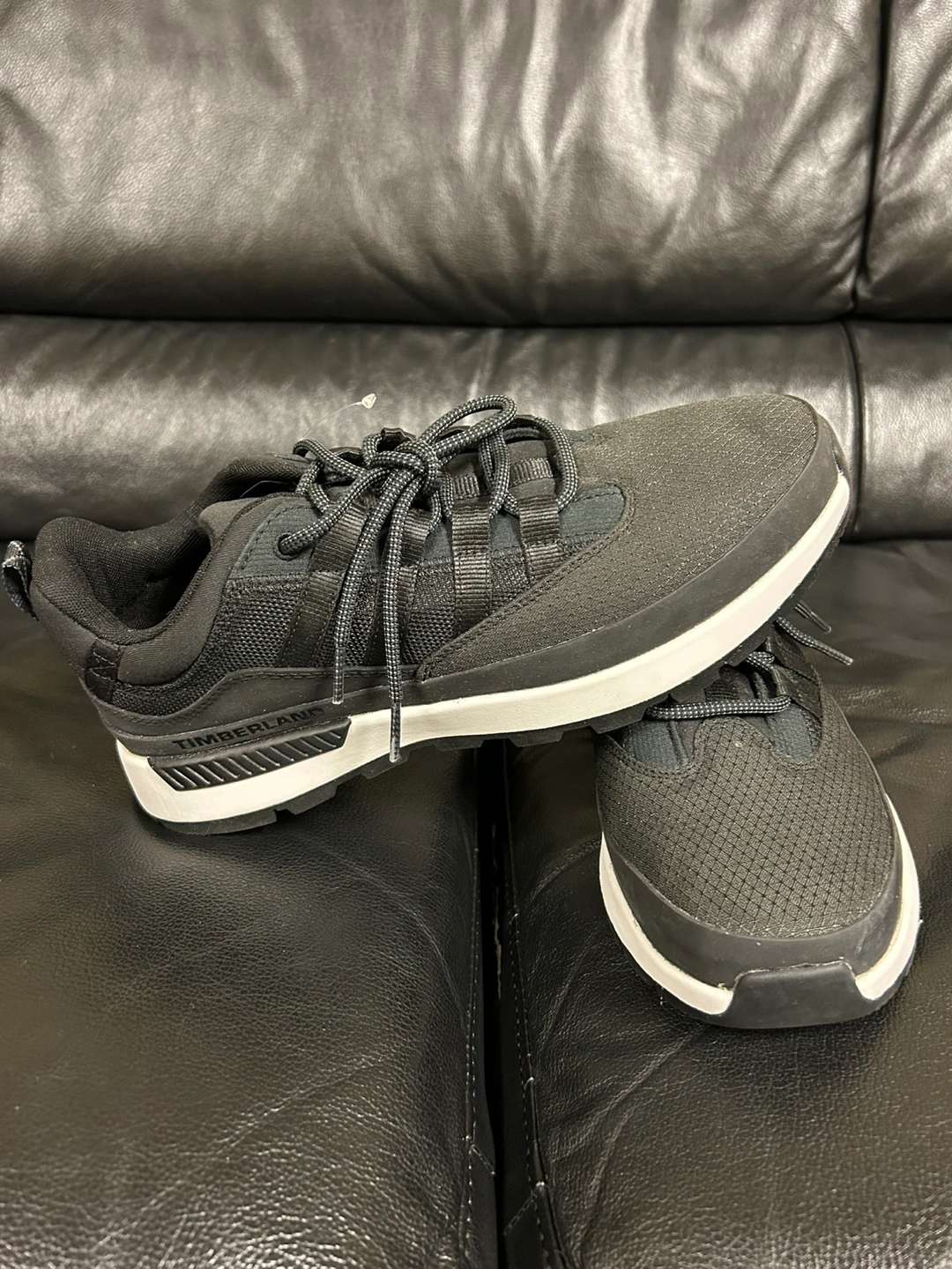 Here are a pair of Timberland Garrison Trail Low shoes in men's size 9. They are black with a white sole. These shoes are perfect for hiking or everyday wear!