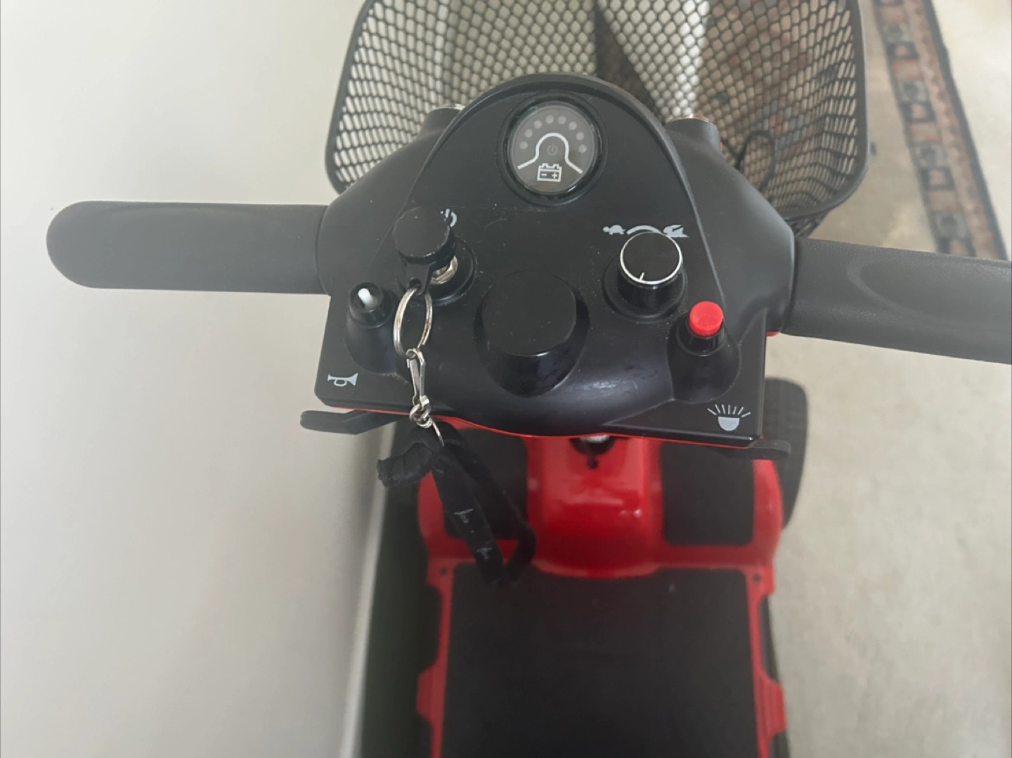 Selling a red Powercar mobility scooter. It's in good condition and ready to go! It features a comfortable seat, a basket for storage, and easy-to-use controls