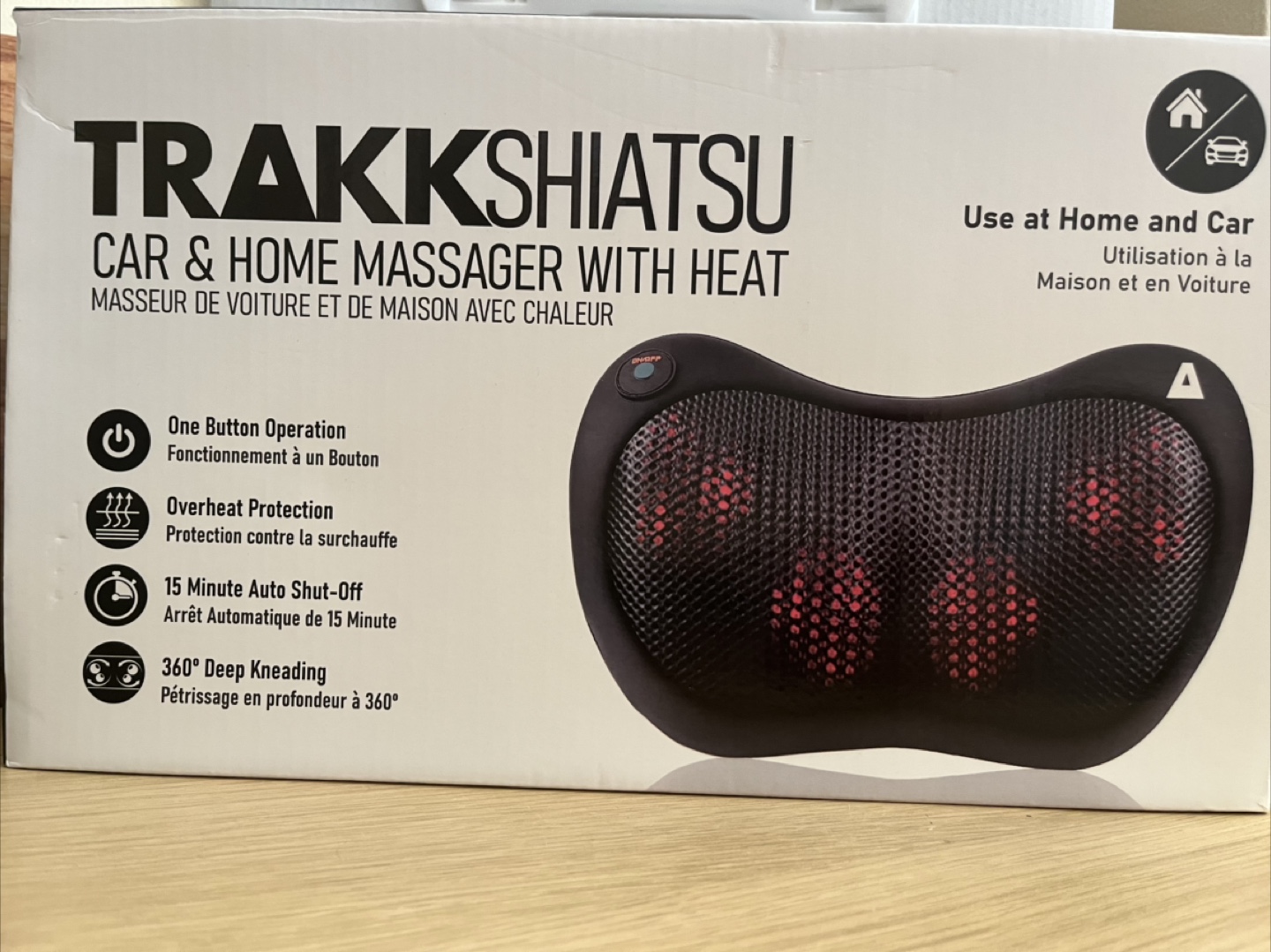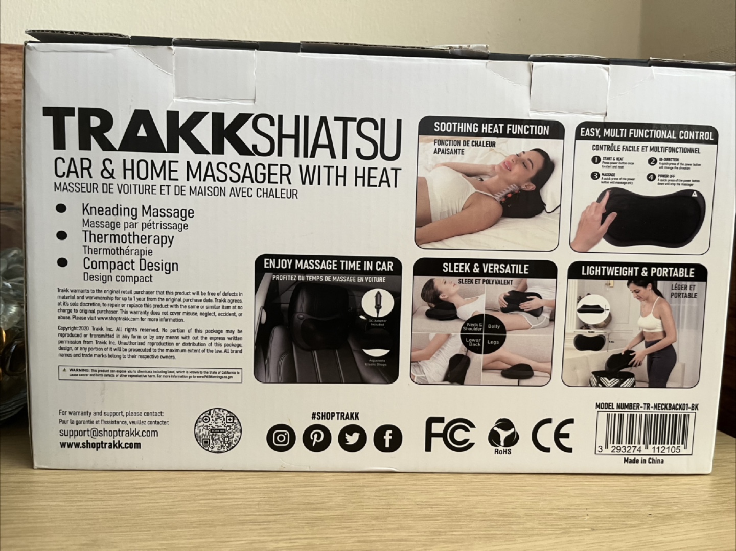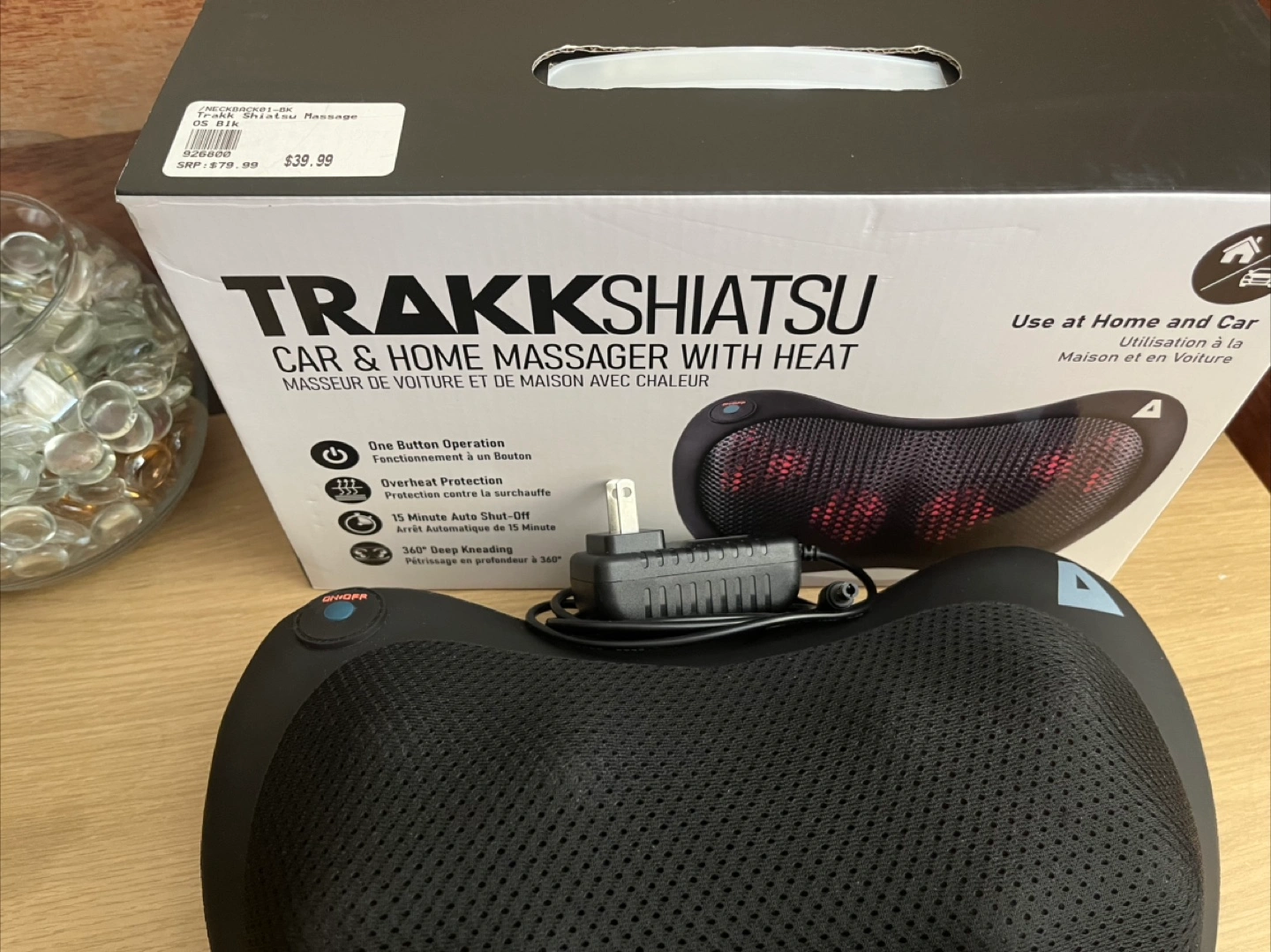 I'm selling a Trakkshiatsu car and home massager with heat! It's lightweight and portable, so you can enjoy a massage anywhere you go. It's easy to use with one-button operation, and it has a soothing heat function. It also has a 15-minute auto shut-off for safety. Never used! Open box.