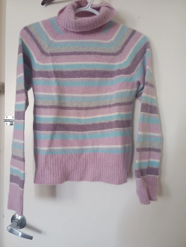 Here's a cozy striped turtleneck sweater! It features a lovely mix of pastel colours, including lavender, light blue, and grey. Perfect for staying warm and stylish during the cooler months