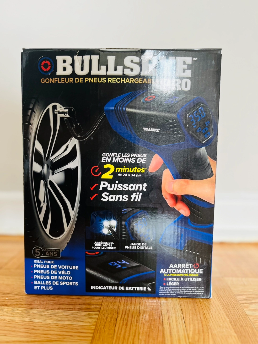 I'm selling a Bullseye Pro rechargeable tire inflator. It can inflate car tires, bicycle tires, and sport balls. It is powerful and cordless, and can inflate tires in less than 2 minutes. It has an automatic shut-off function and is lightweight and easy to use. Includes a Bullseye inflator, a 20V cigarette battery pack, a USB-C battery charging cable, a high-volume hose, a sports needle, and a cone adapter