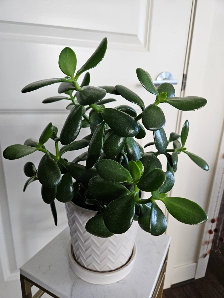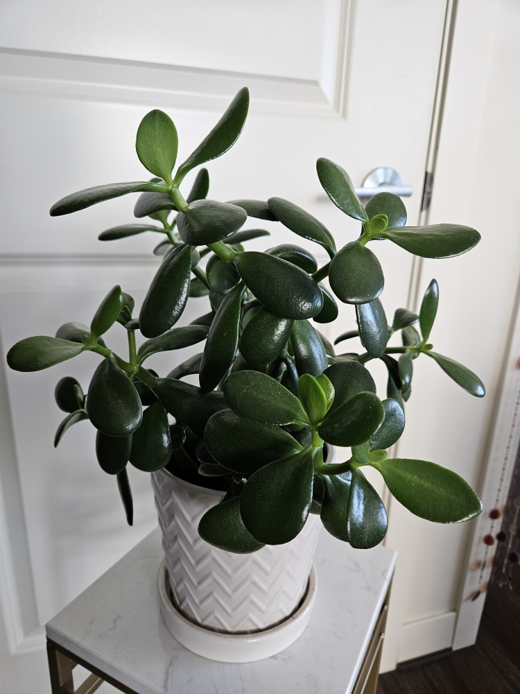 A lovely jade plant in a white pot, perfect for adding some greenery to your home! It's a healthy and thriving plant, ready to bring some good vibes to your space. This is also called a 'Money plant' in Asia.