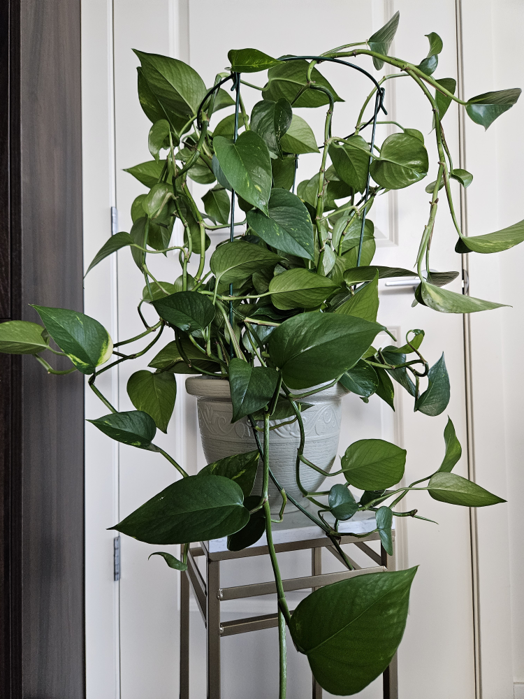 I'm selling a lovely golden pothos plant in a decorative pot. It's a great way to add some greenery to your home! The plant is healthy and well-established. It is in a plastic pot and includes a round green plastic-covered wired support.