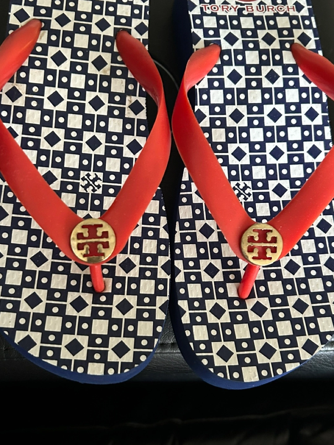 23Cute Tory Burch flip flops with a navy and white pattern and red straps. Size 8. Perfect for summer!