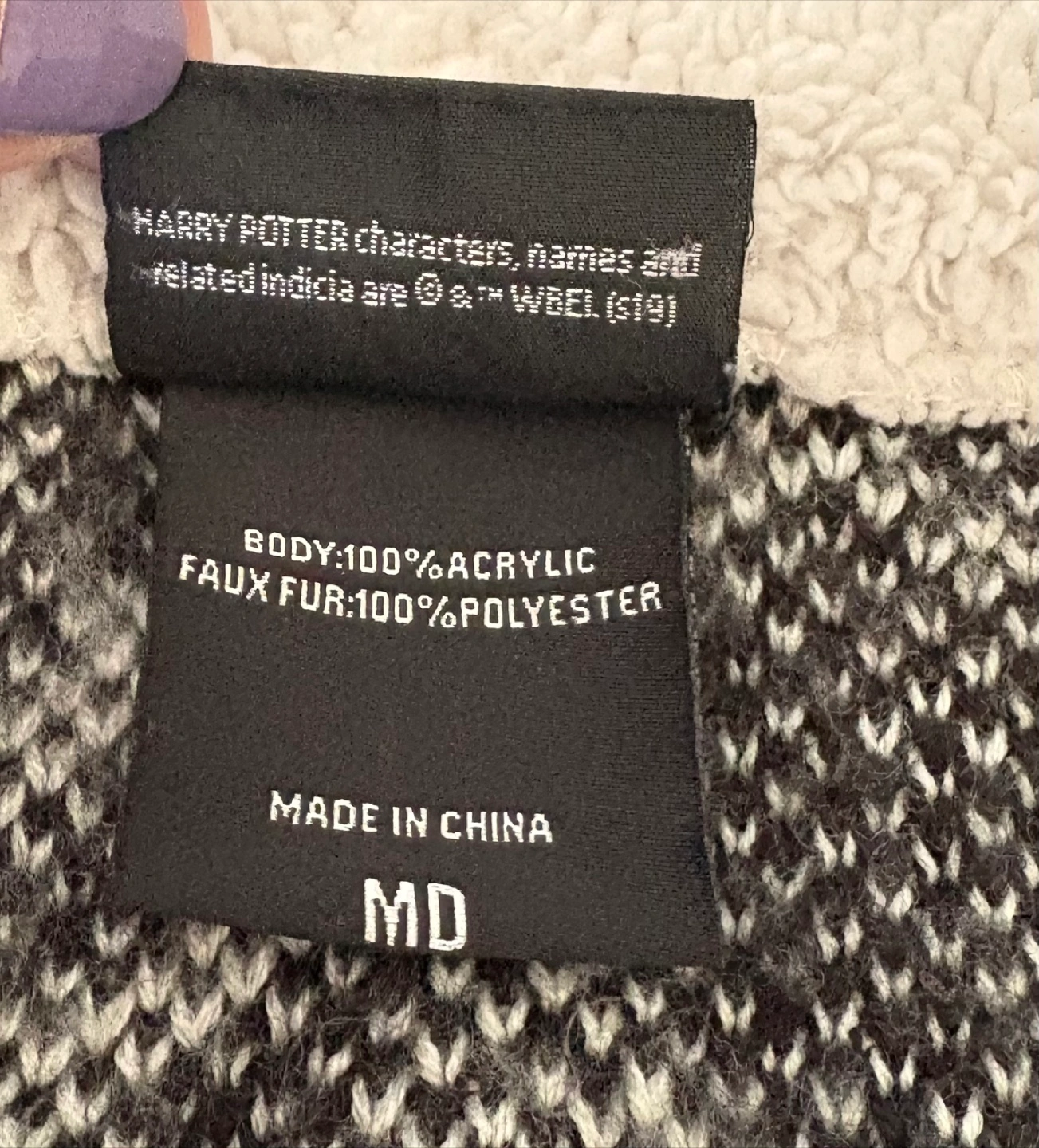 It's a Size M/L and features a fun black and white pattern with symbols from the Harry Potter series.