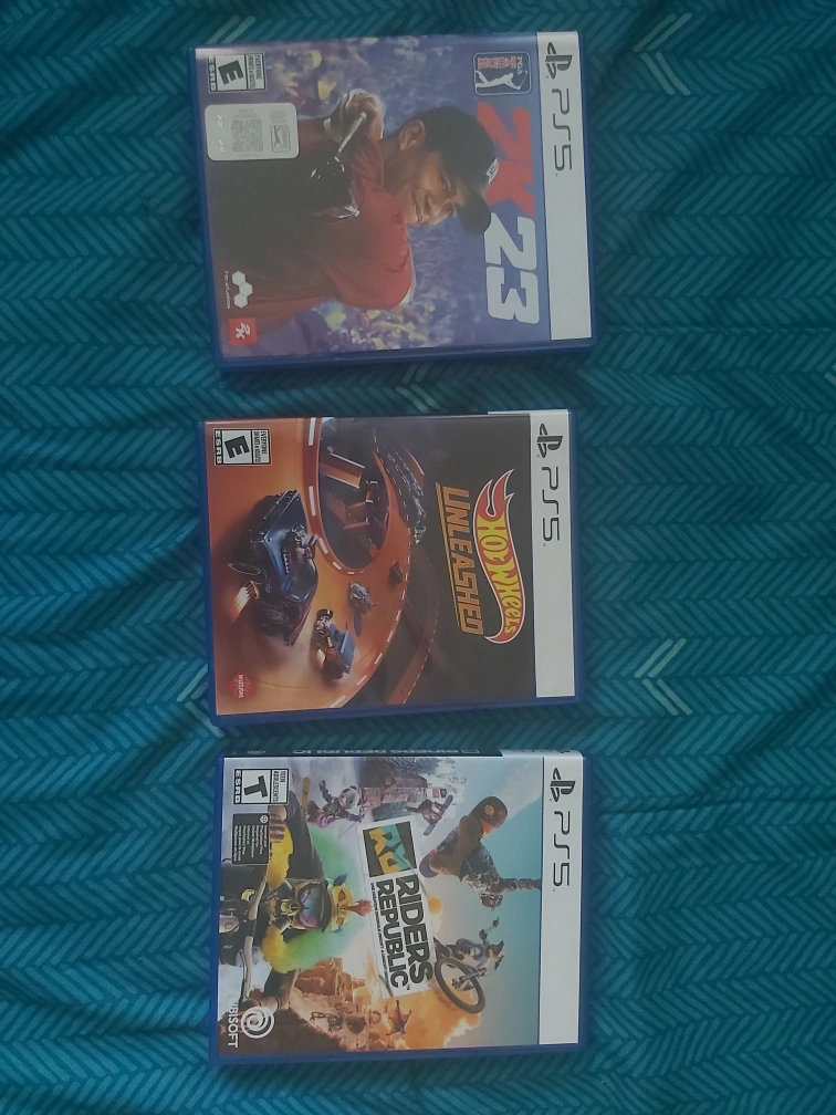Selling three PS5 games together! Includes Tiger Woods 2K23, Hot Wheels Unleashed, and Riders Republic. All games are in great condition and ready for a new home