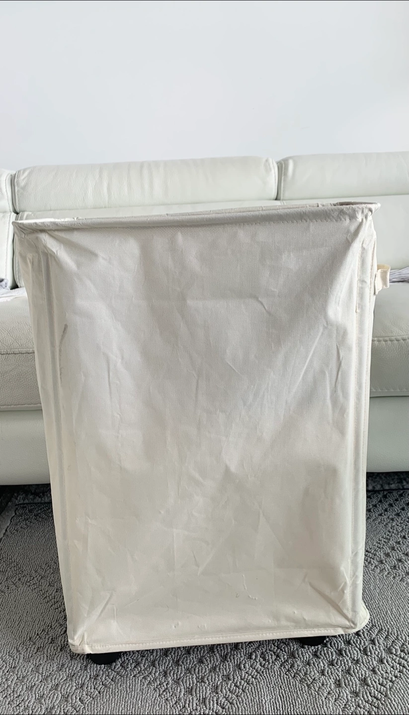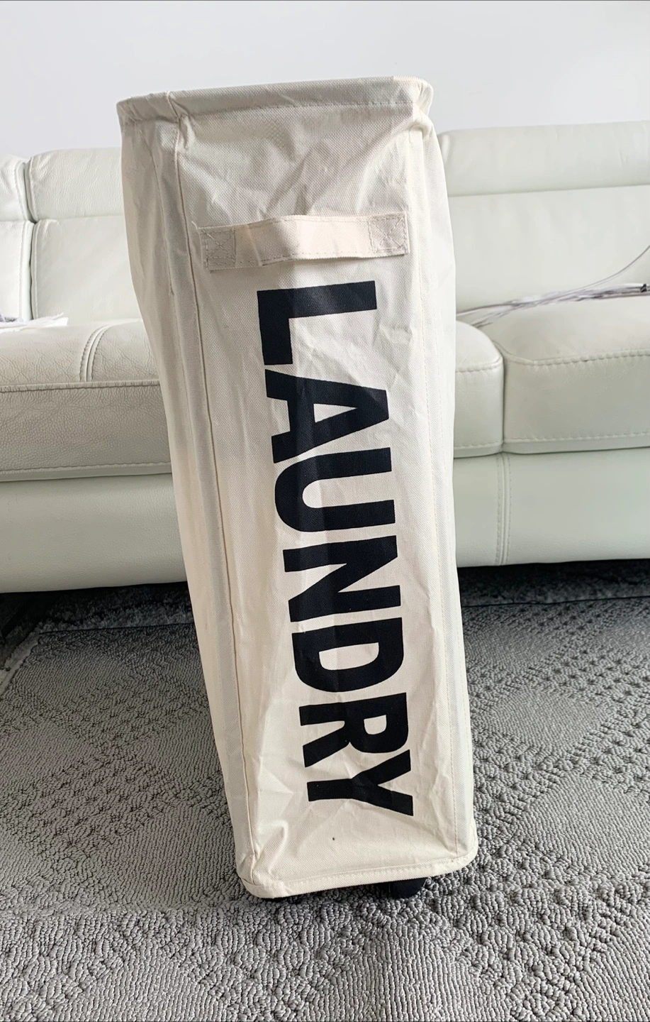 Selling a laundry hamper that is ready for a second life! 4 wheels that works perfectly to avoid carrying your bag and simply roll it with a practical handle. Nice mesh on top that let you pile more clothes on top of it. Rigid hamper. Need a little cleaning. Wrinkly due to being folded pre-pic.