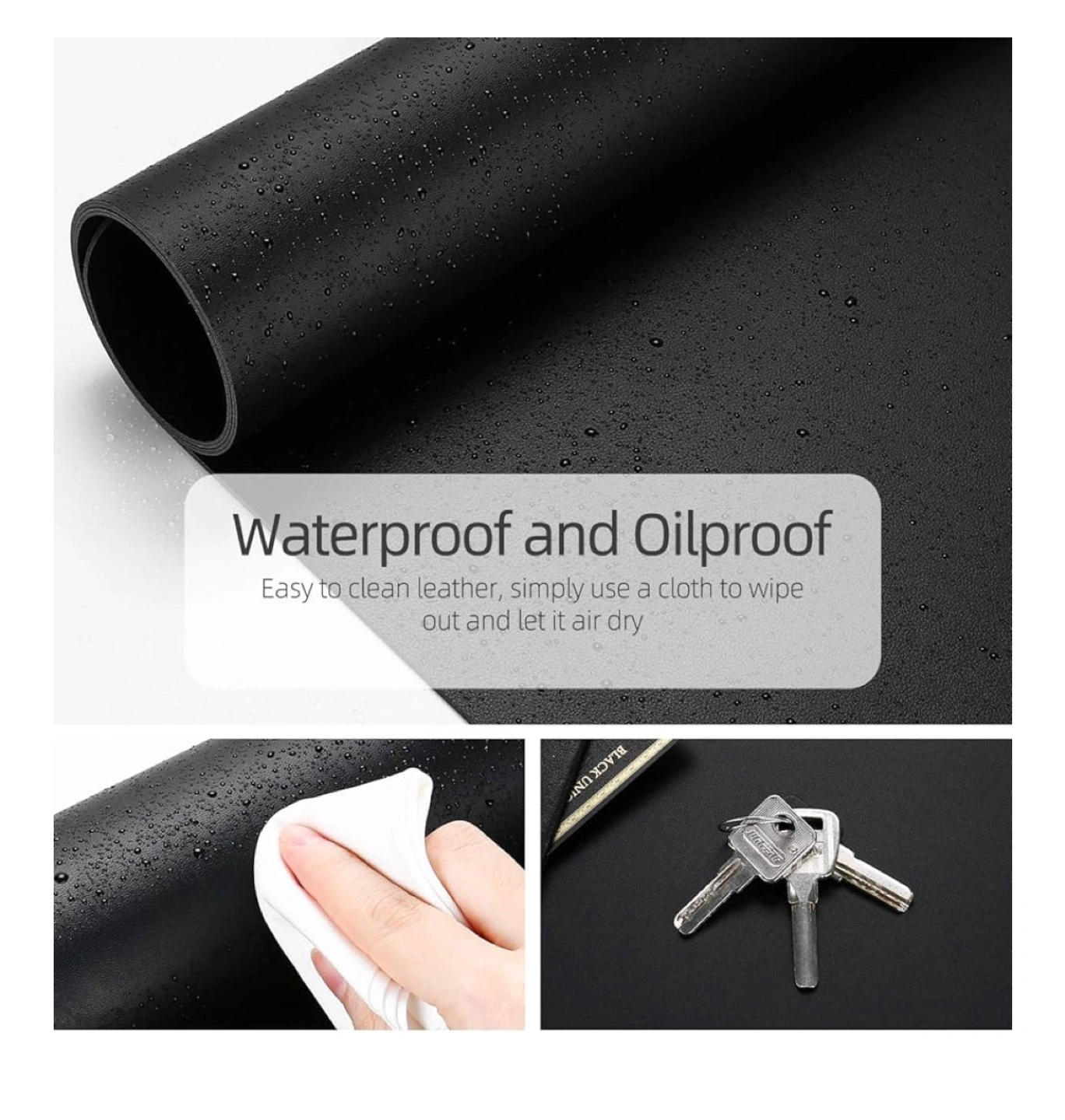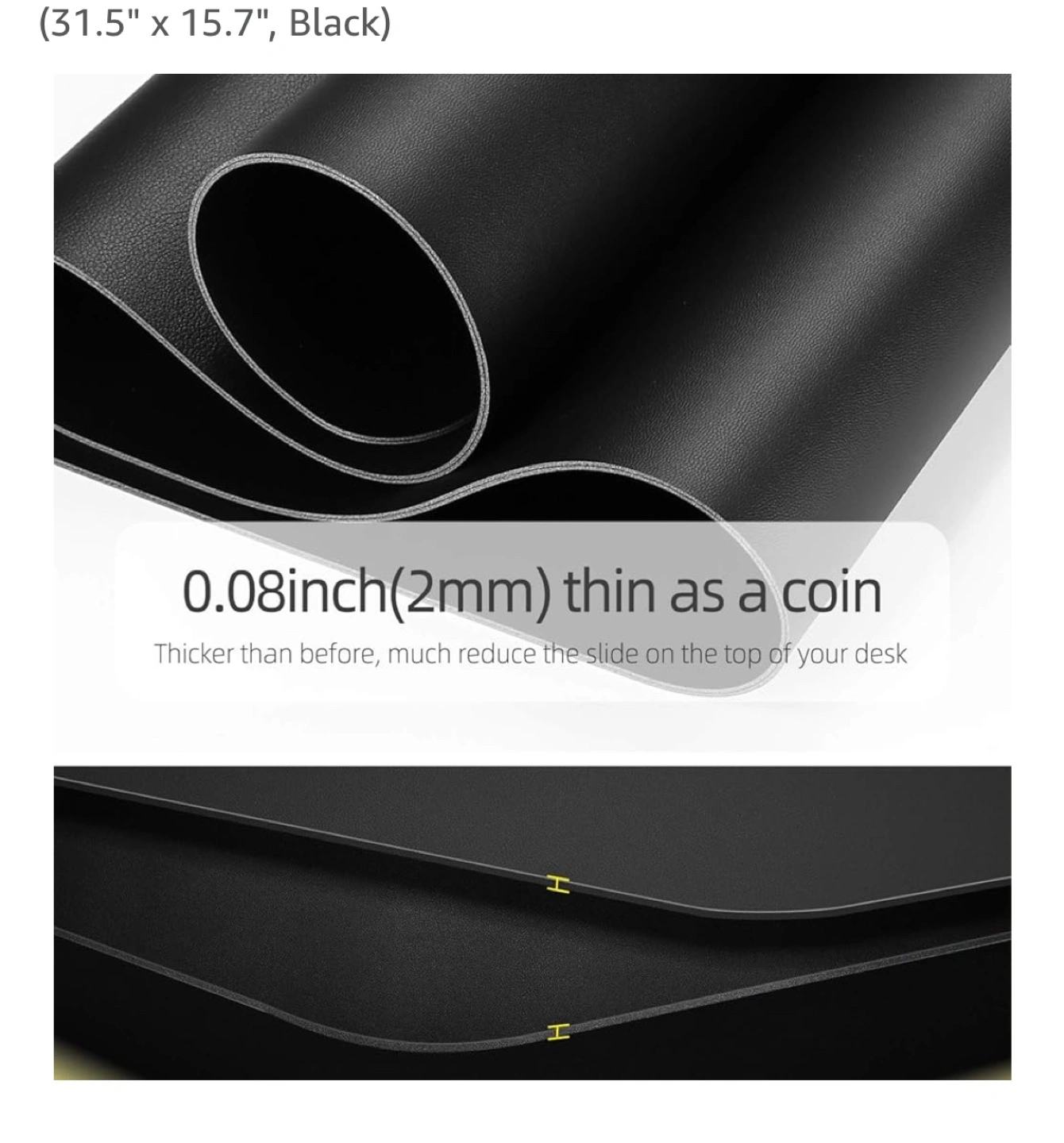 394This is a black YSAGi desk pad, sized at 31.5 inches by 15.7 inches. It's waterproof and oilproof, making it easy to clean with just a cloth. It's also designed to be thin, only 0.08 inches (2mm), which helps reduce sliding on your desk. Comes in the original box! Never opened