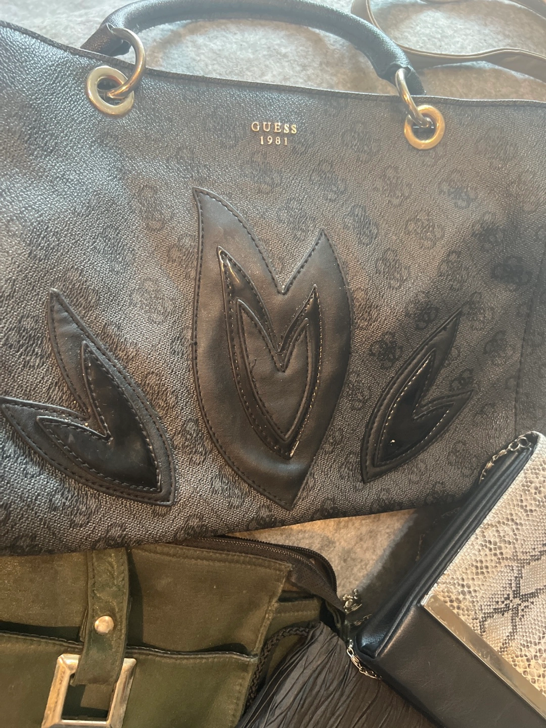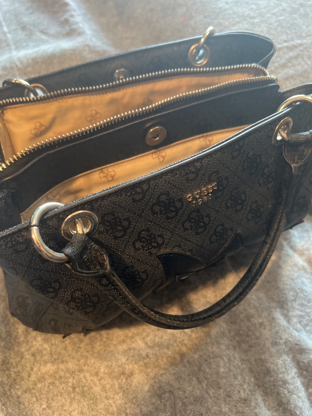 Here's a Guess 1981 handbag in black. It has a unique design with black accents. It has a zipper closure and is a great size for everyday use