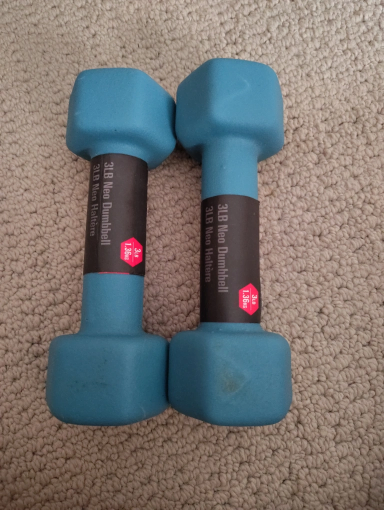 Selling a pair of 3LB Neo Dumbbells! They're in good condition and perfect for light workouts at home. Each dumbbell weighs 1.36kg.