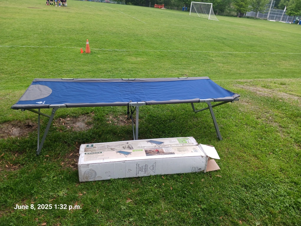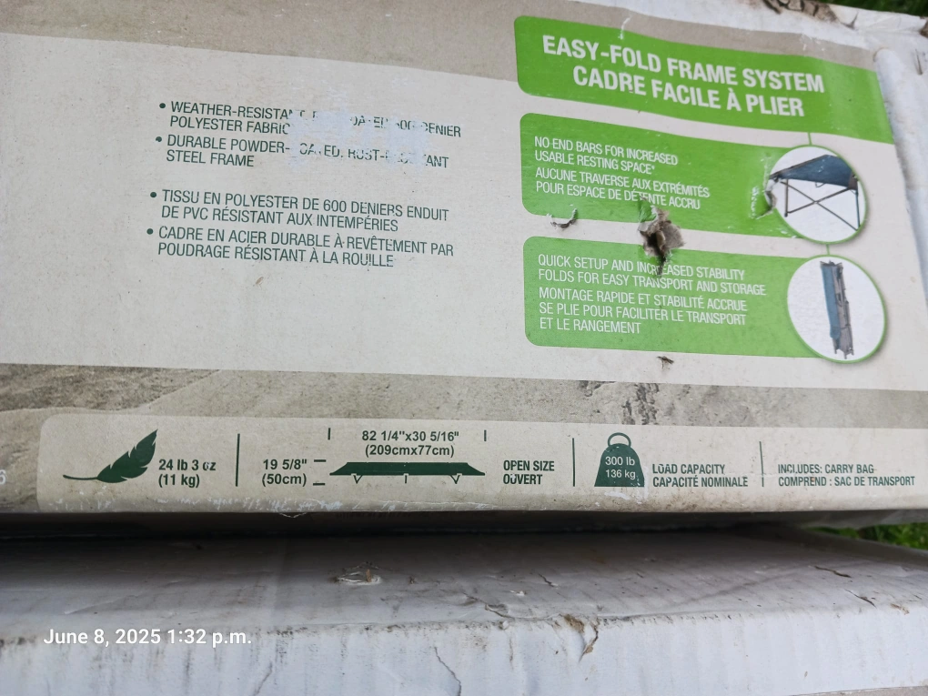 Get ready for camping season with this 2 extra-large instant camp cot from Woods! It's super convenient and sets up in a flash. Perfect for a comfortable night's sleep under the stars. Includes the original box. one is used twice the other never used.