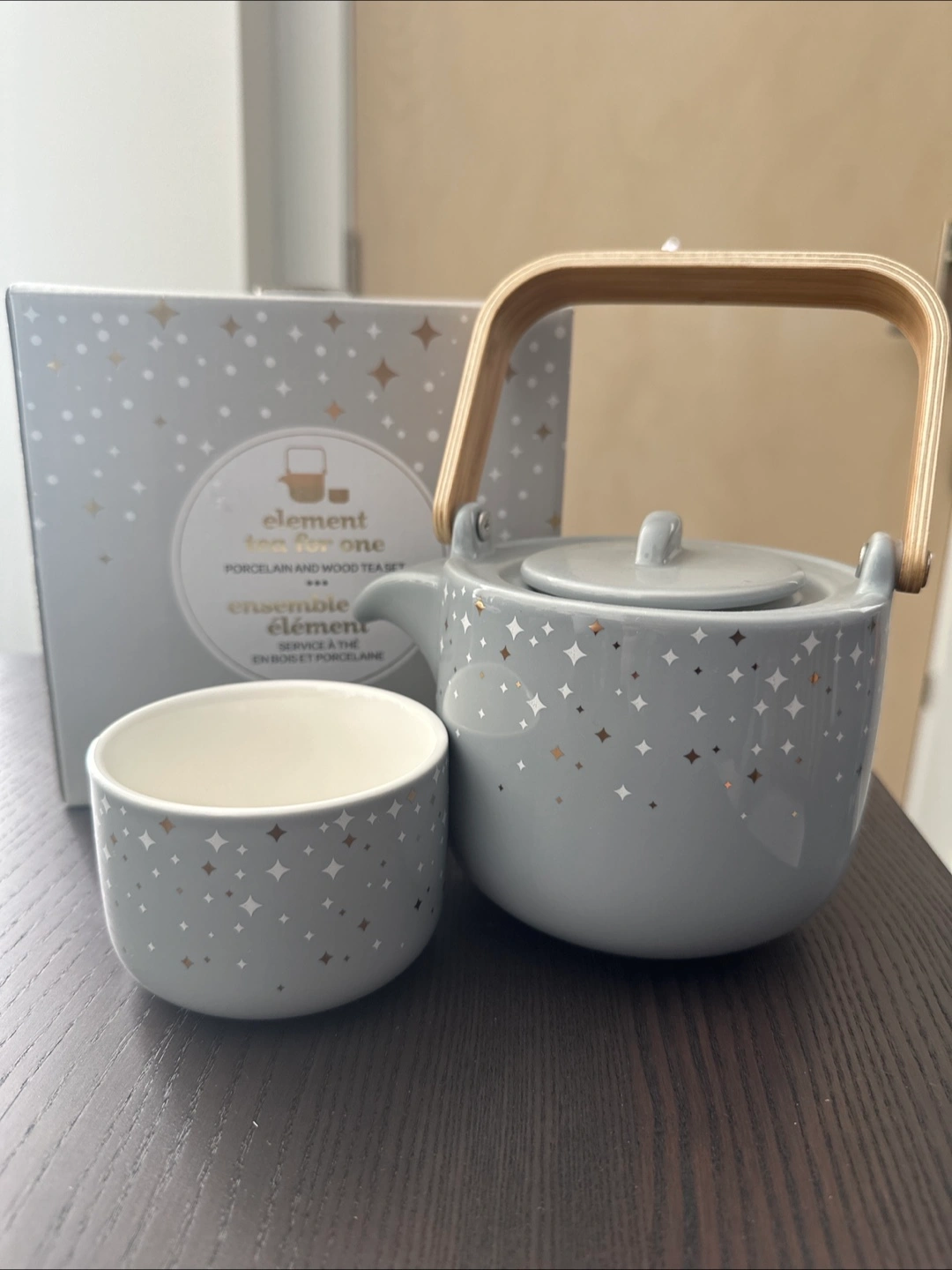 Selling a lovely Element Tea for One set! It's a porcelain and wood tea set, perfect for a cozy cuppa. The set includes a teapot and a cup, both in a charming grey colour with star details. Comes with the original box!