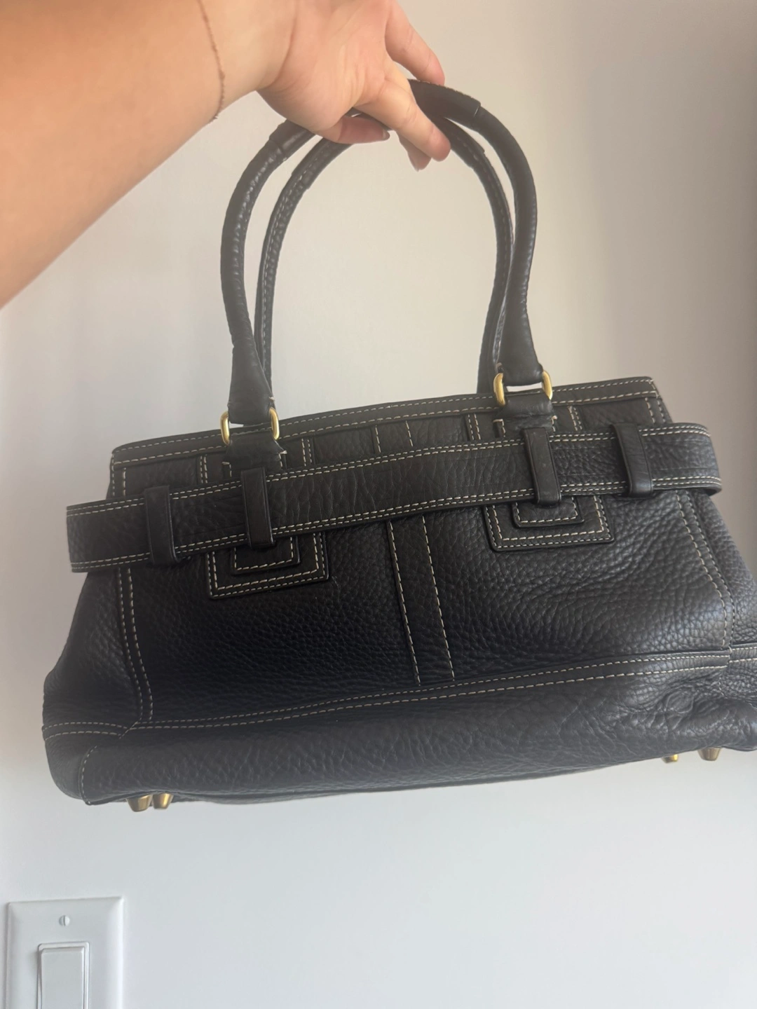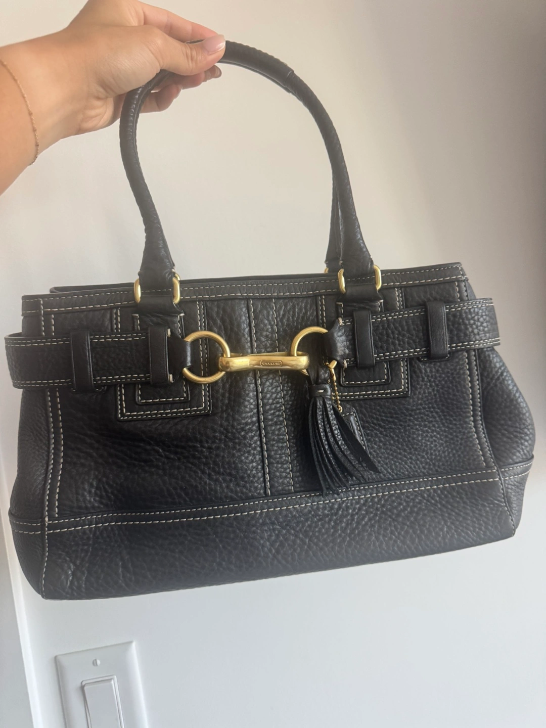 Selling a beautiful Coach handbag in black leather. It's in excellent condition and ready for a new home! The bag features a stylish design with detailed stitching and a tassel accent. Perfect for everyday use or a special occasion!