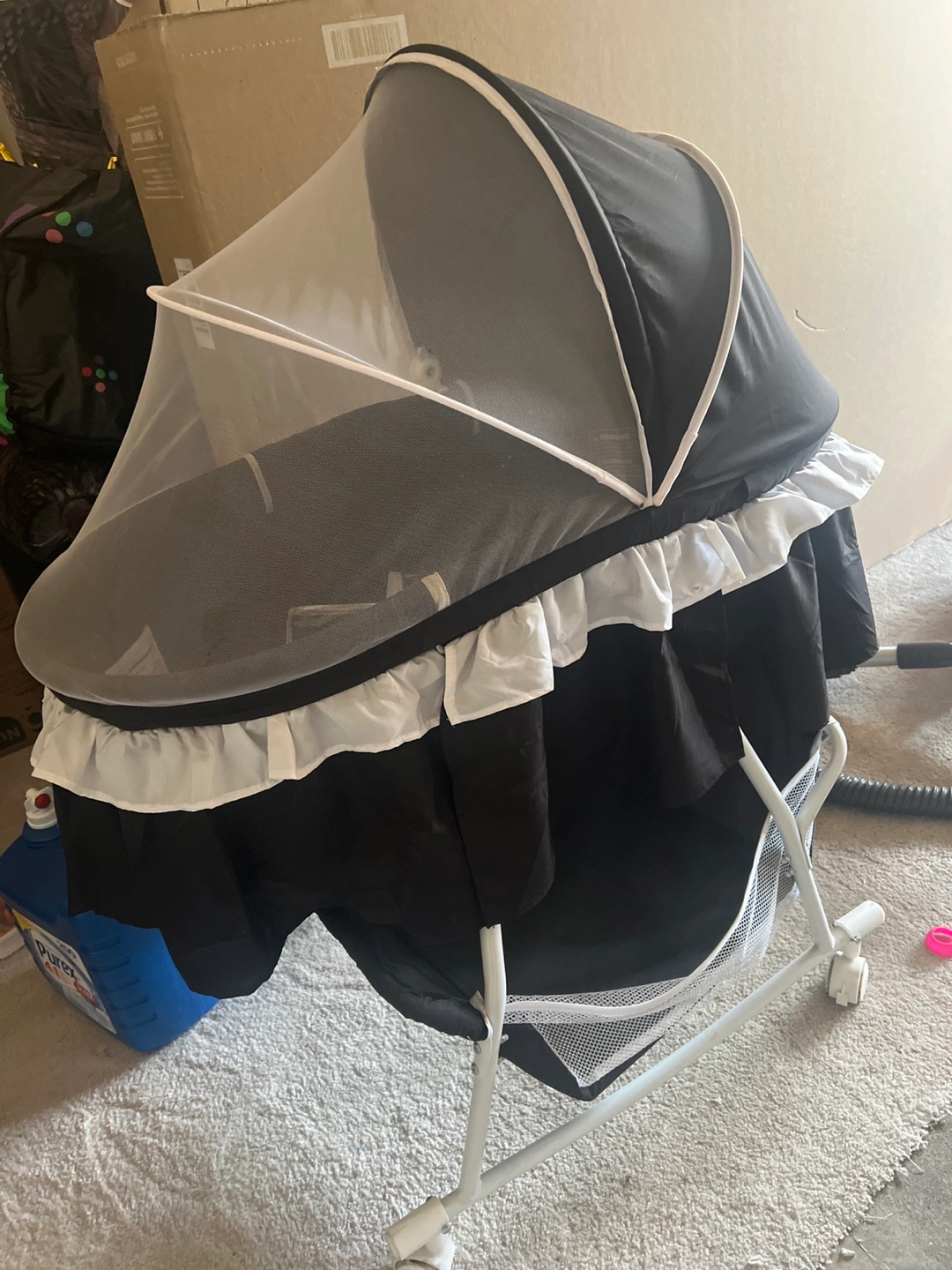 Selling a gently used black bassinet! It comes with a mosquito net to keep your little one safe and sound. The bassinet also has a storage basket underneath for baby essentials
