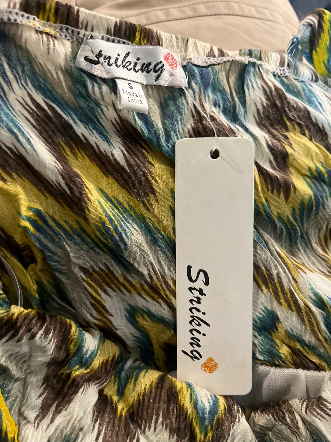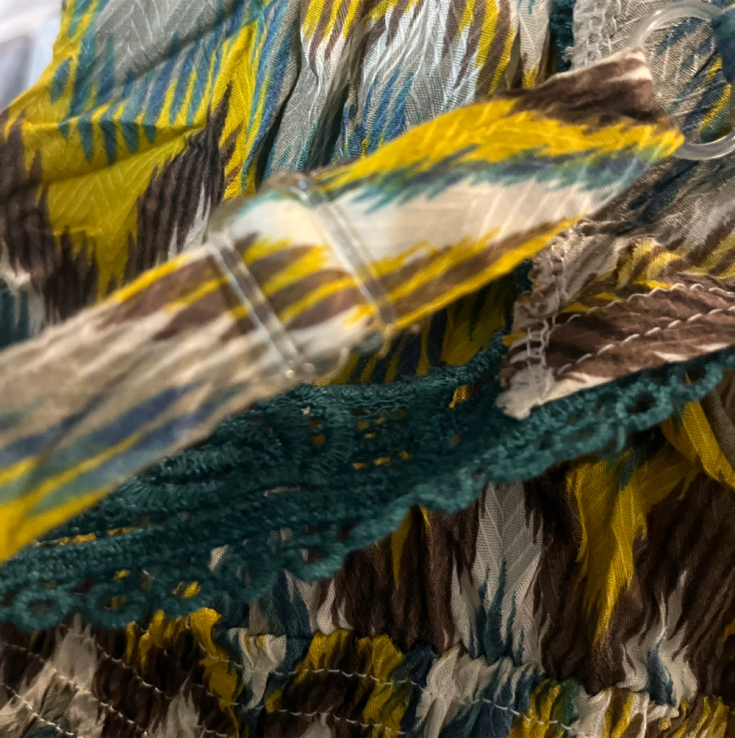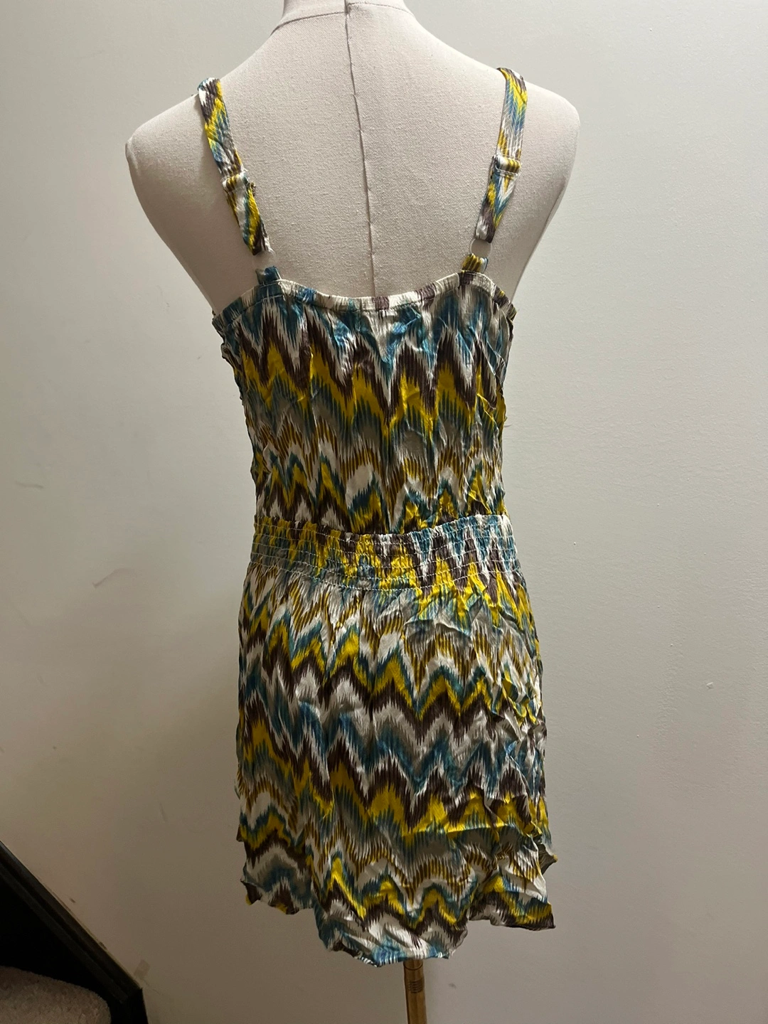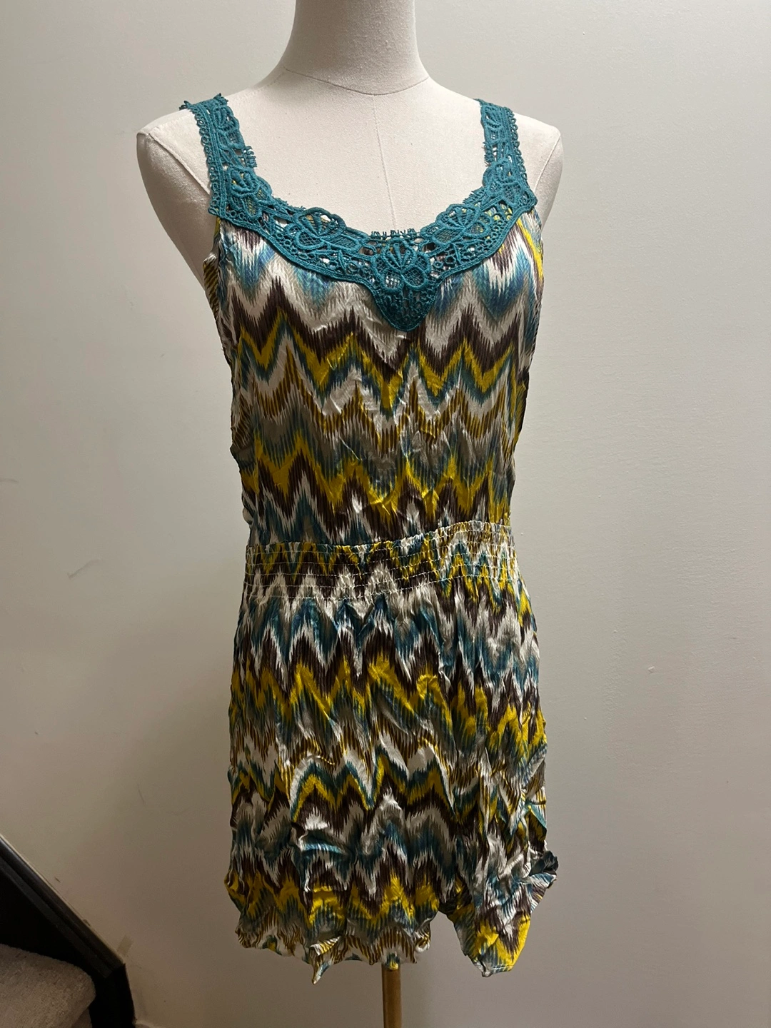 Brand new with tags Pickup Brampton or downtown Toronto Approximate measurements: PTP 19” Waist scrunch 13” (17” with stretch) Length 34” Stylish dress featuring a chevron pattern with teal lace detailing. Perfect for casual outings or beach vibes! —BinB—