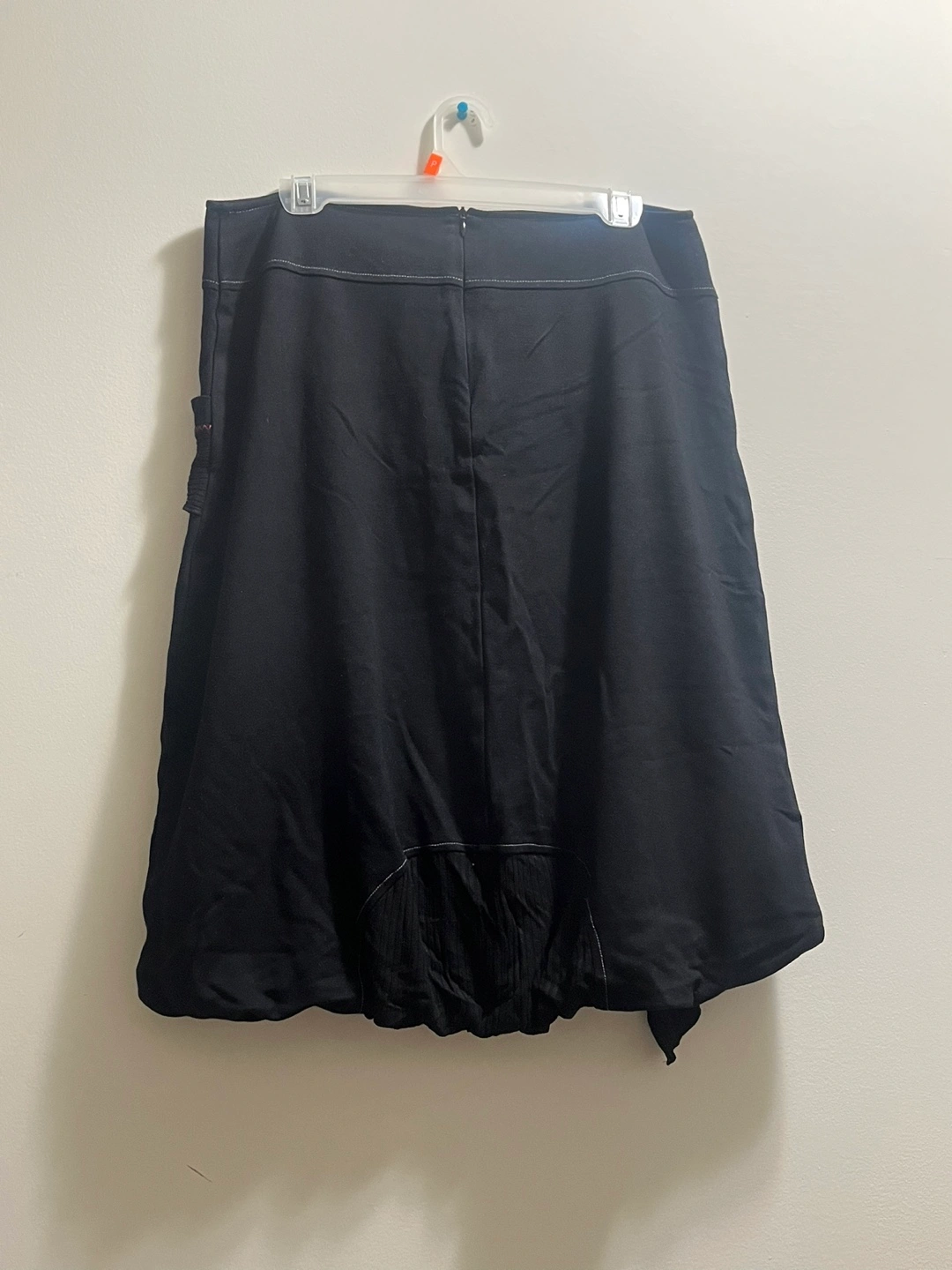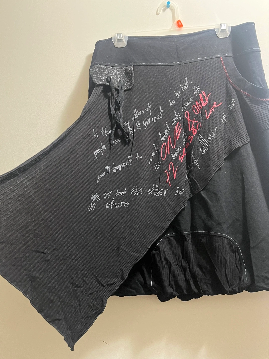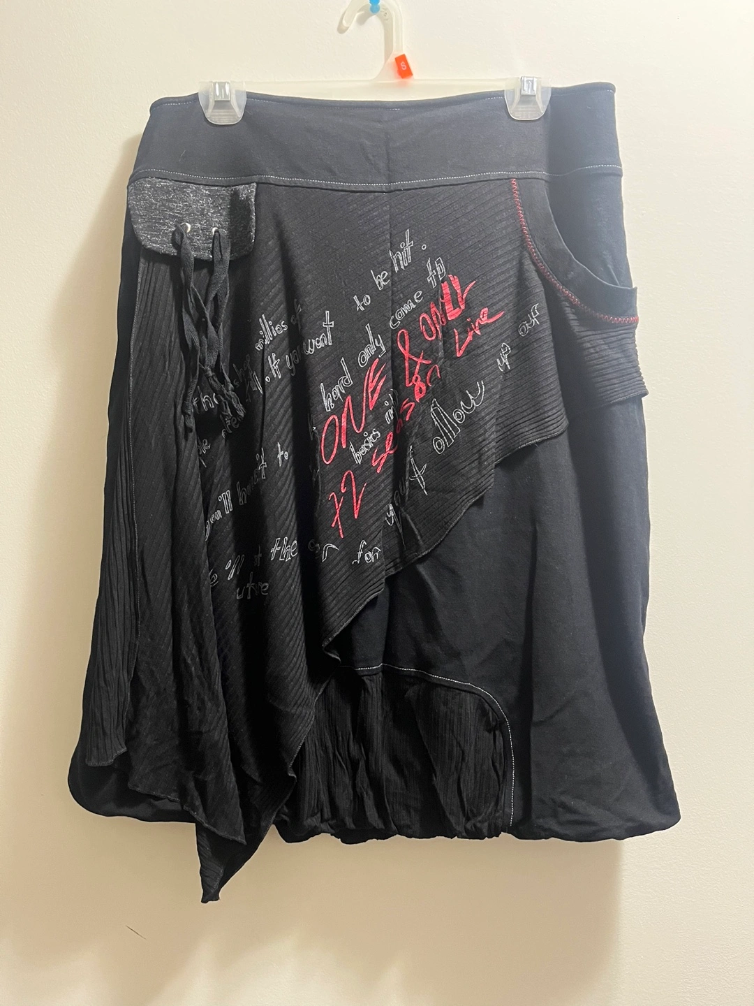 Like new condition, just been stored away Pickup Brampton or downtown Toronto Chic black skirt with unique asymmetrical design. Features bold red and subtle gray accent writings. Perfect for a standout look. No pockets, just a design Back has a zipper down the middle Approximate measurements: Waist 16.5”-17” Length 26” —BinB9-04—