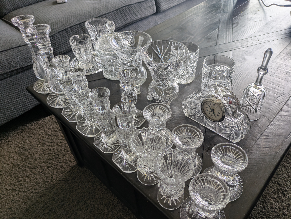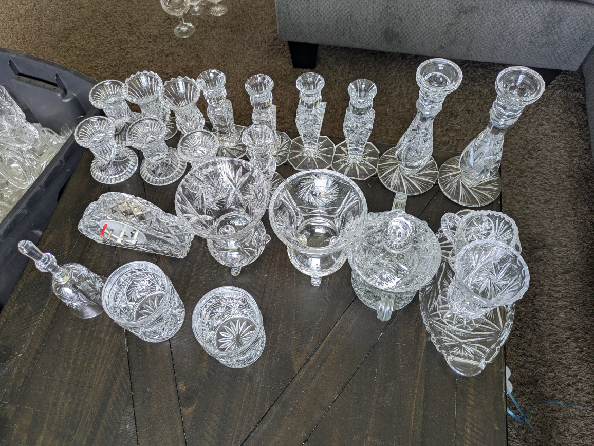 Selling a collection of crystal glassware. Perfect for adding a touch of elegance to your home. Includes vases, candle holders, bowls, and more. All pieces are in good condition and ready to be displayed 24 PINWHEEL all together $250 takes them all