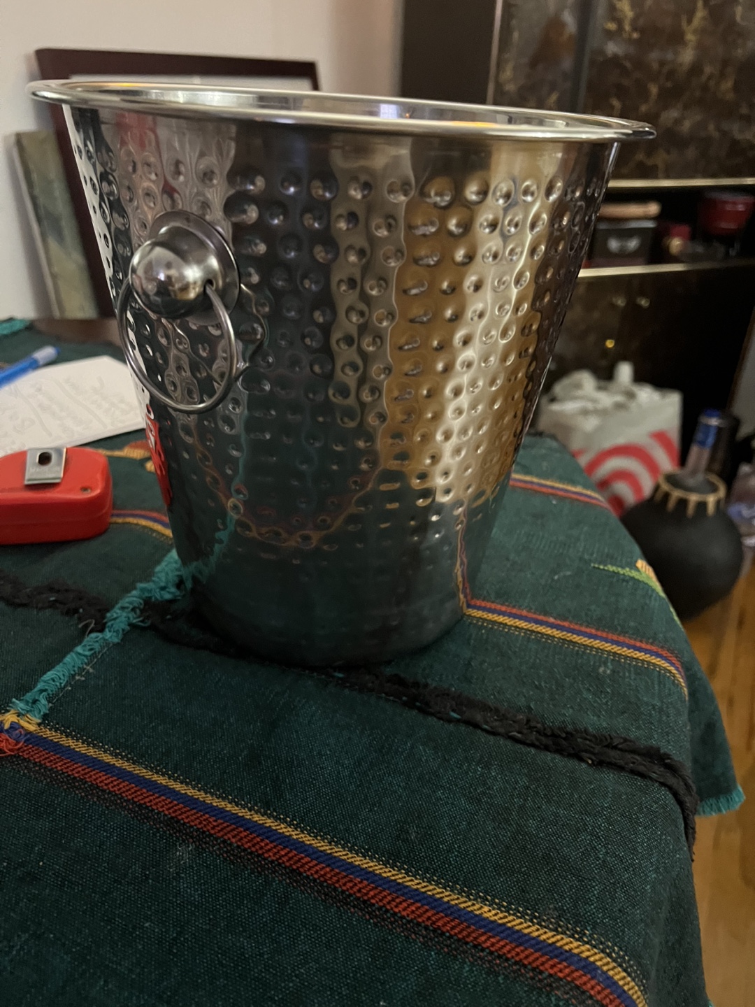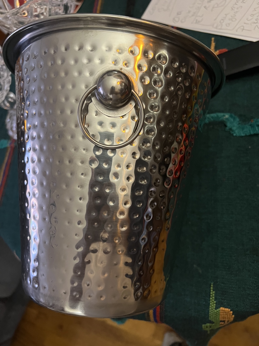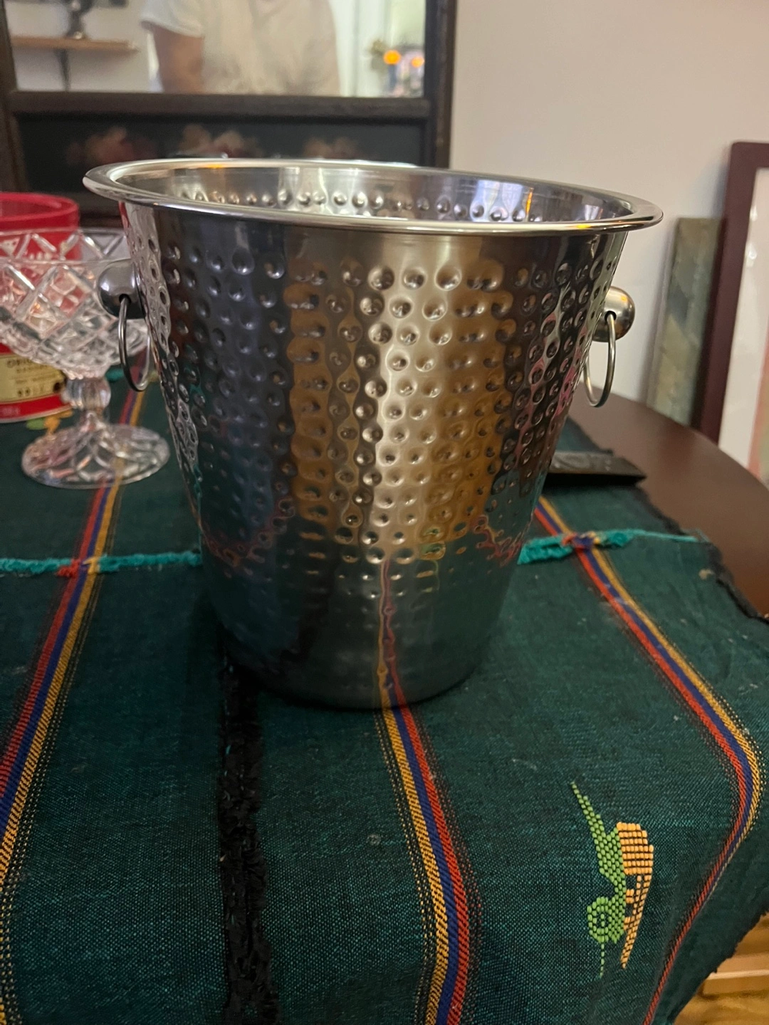 Selling a hammered wine bucket with a 4 quart capacity. It's in great condition and ready to keep your drinks chilled! The bucket is made in India and has a nice hammered texture.