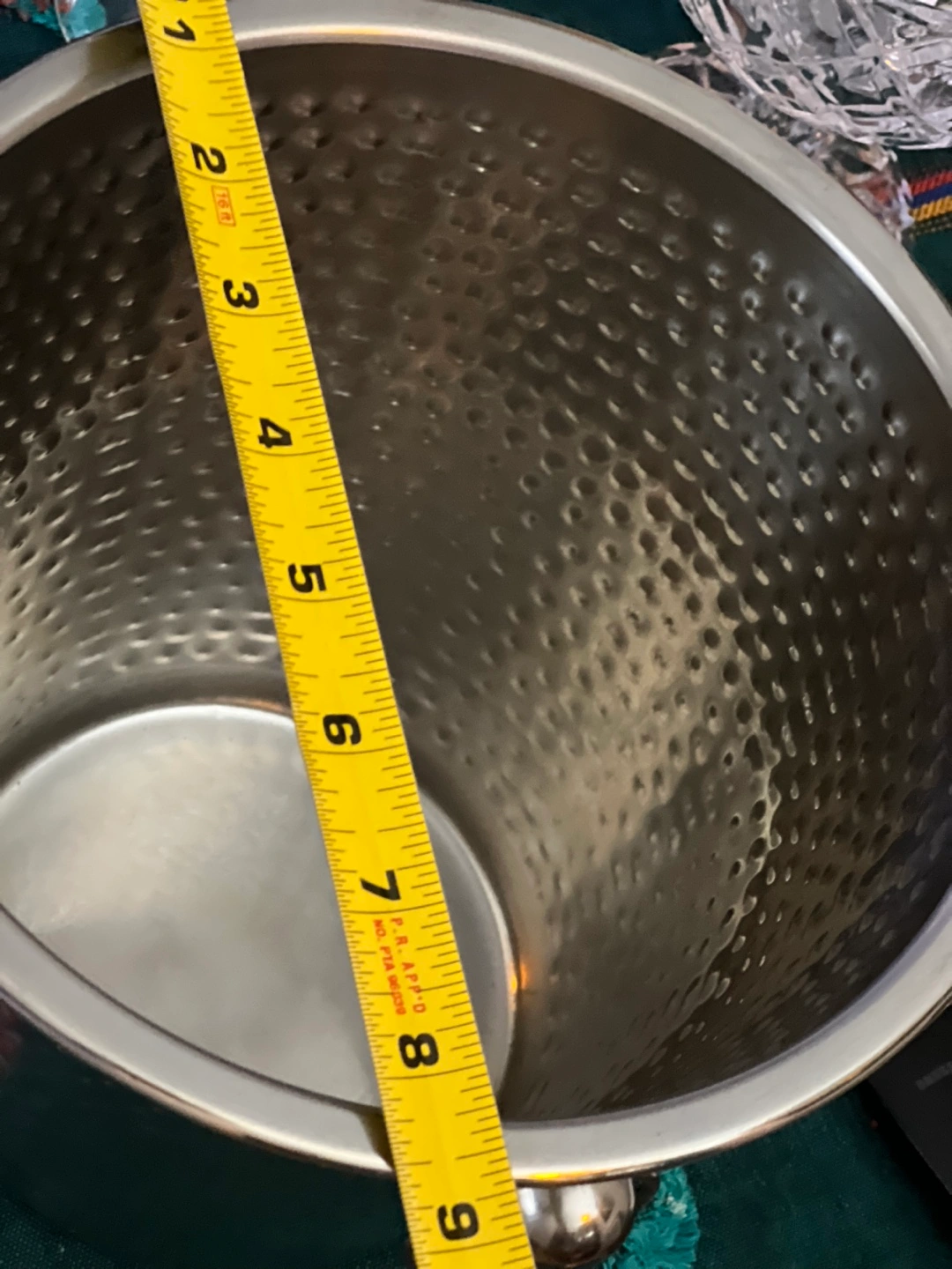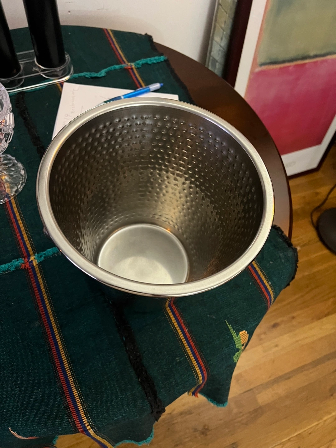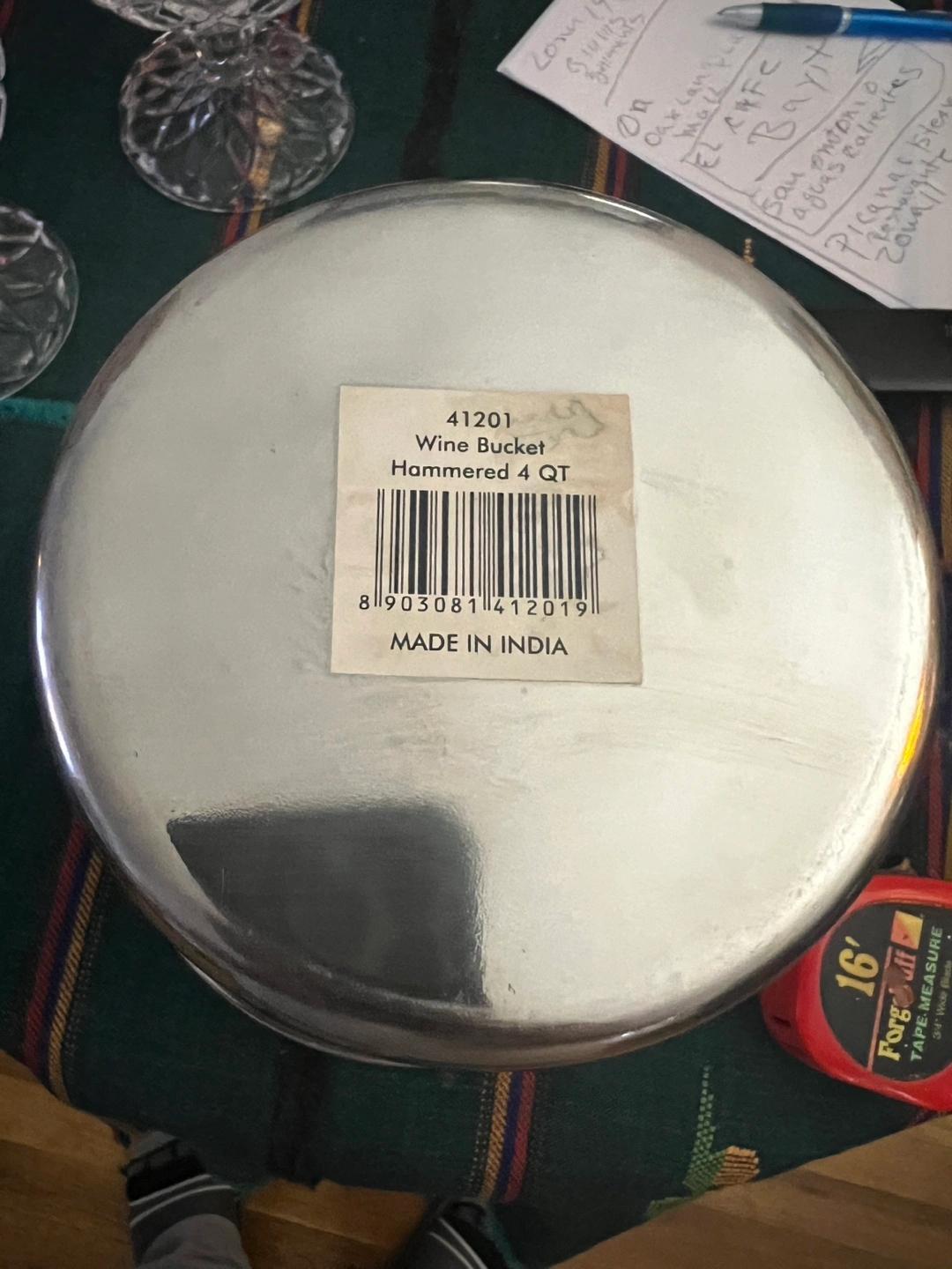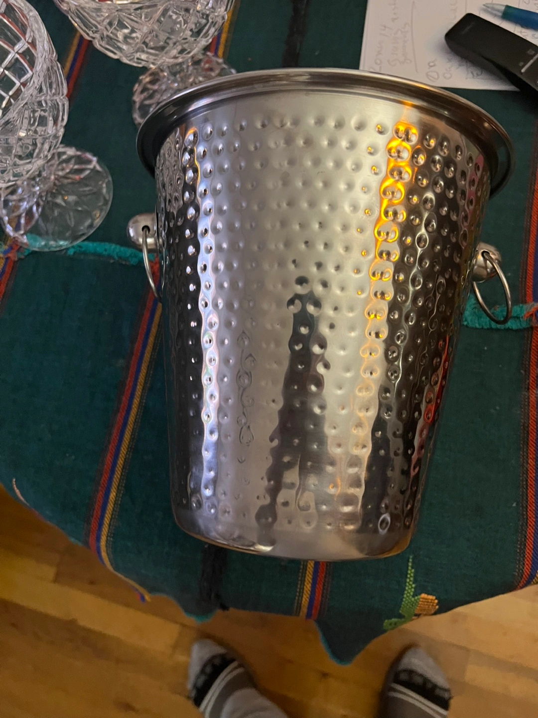 Selling a hammered wine bucket with a 4 quart capacity. It's in great condition and ready to keep your drinks chilled! The bucket is made in India and has a nice hammered texture.