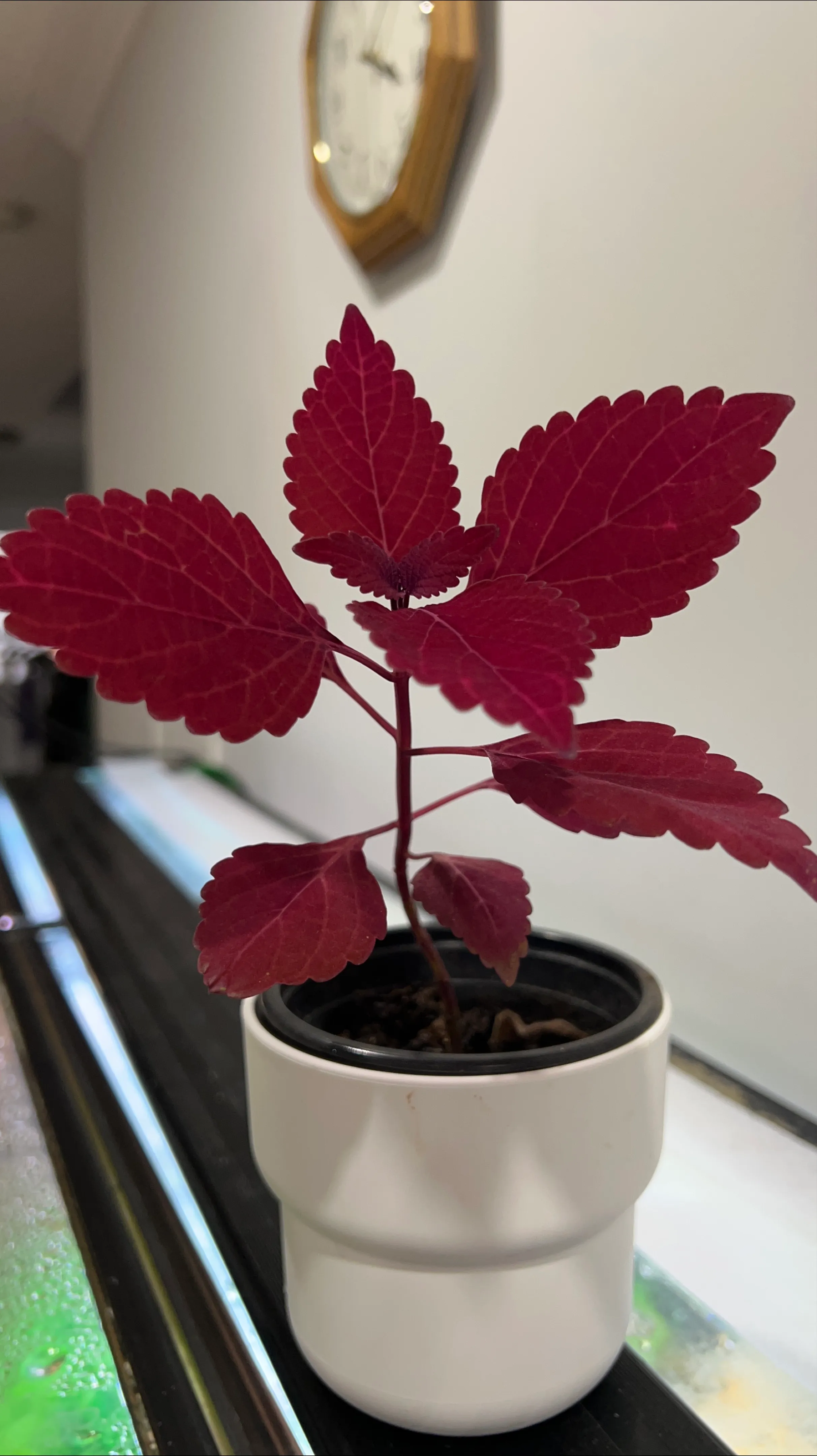 A vibrant coleus plant in a simple white pot, ready to brighten up your space! The leaves have a lovely deep red colour. It's a healthy little plant looking for a new home